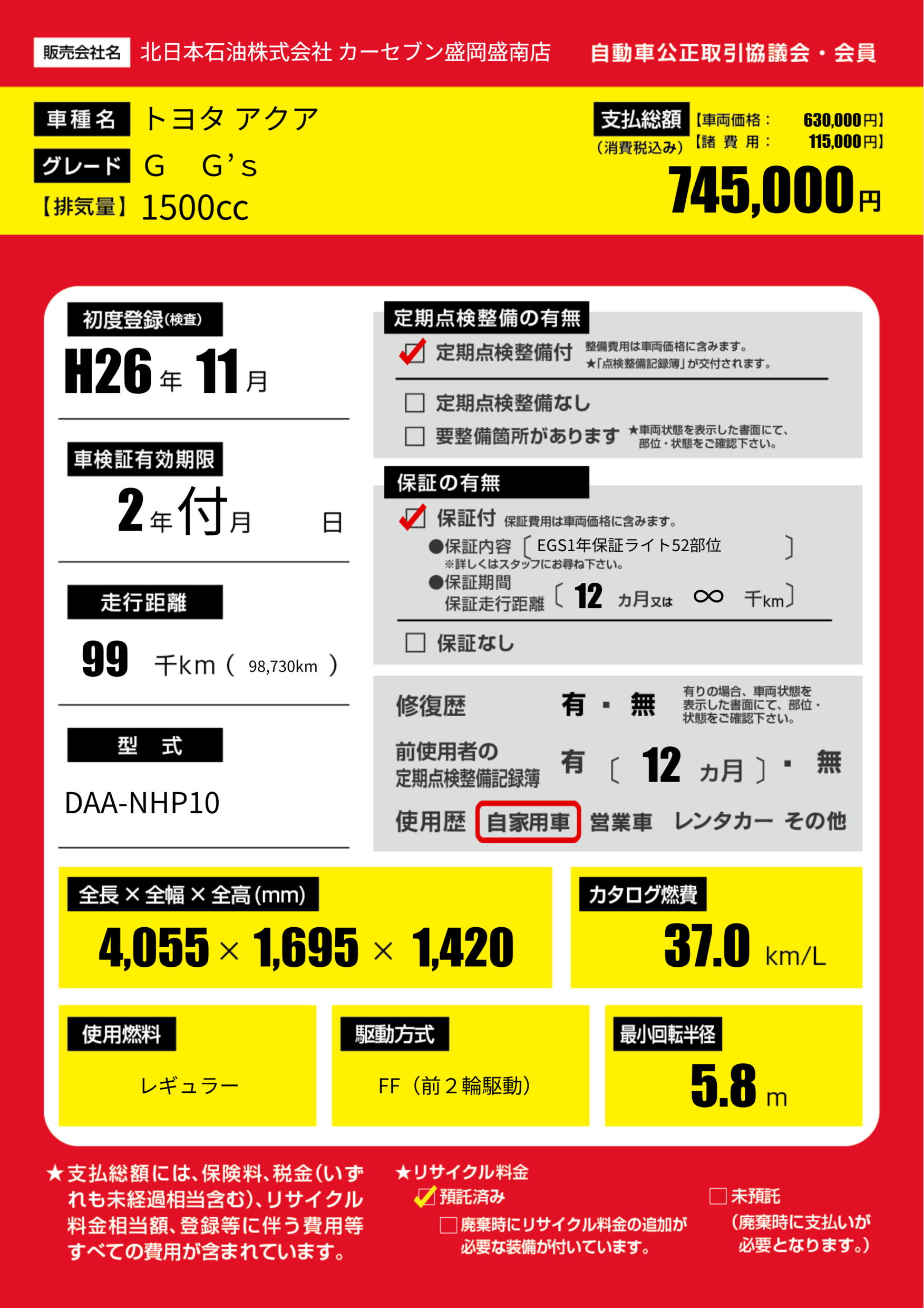 | 車名 | トヨタ アクア | グレード ミッション 排気量 |