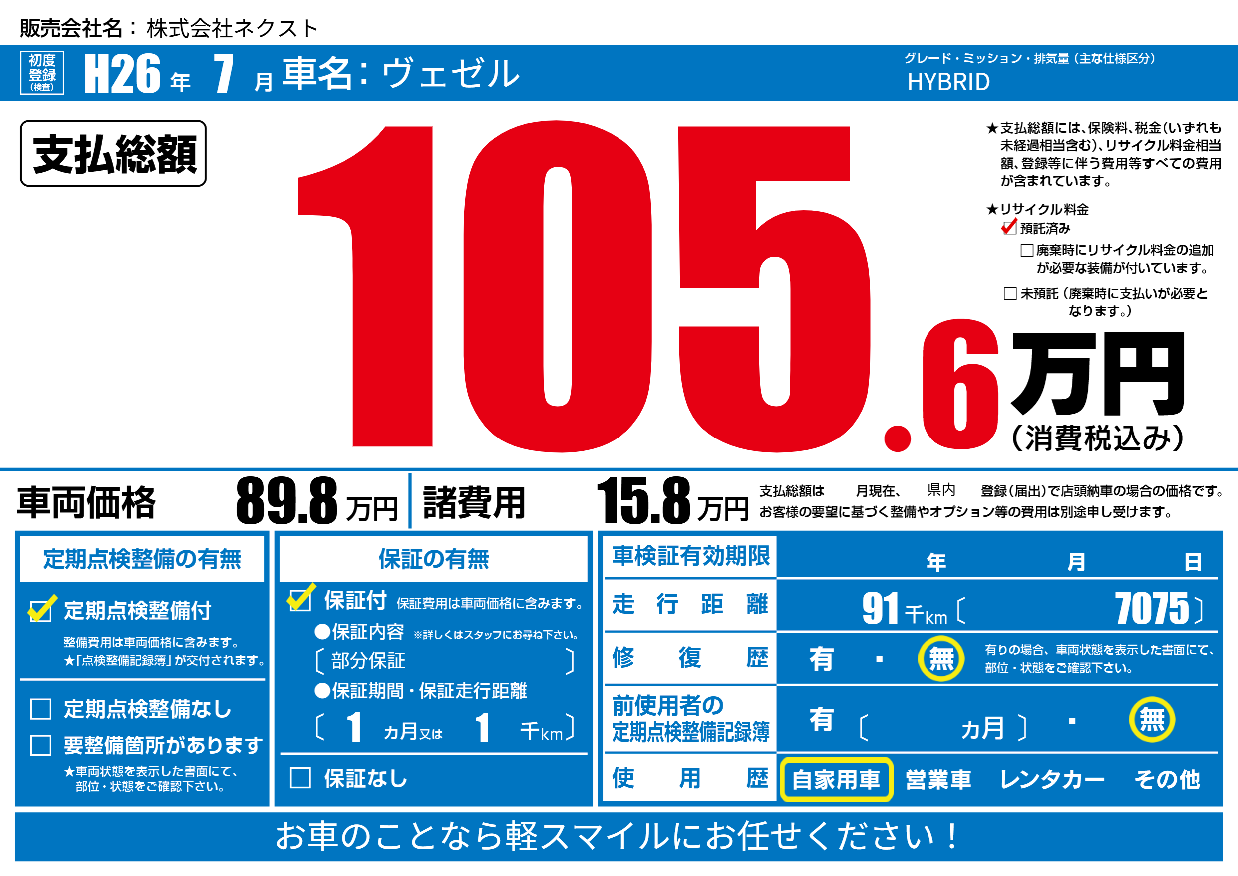 | 走行キロ | 9.1万km | 初年度登録 | H26年7月 |