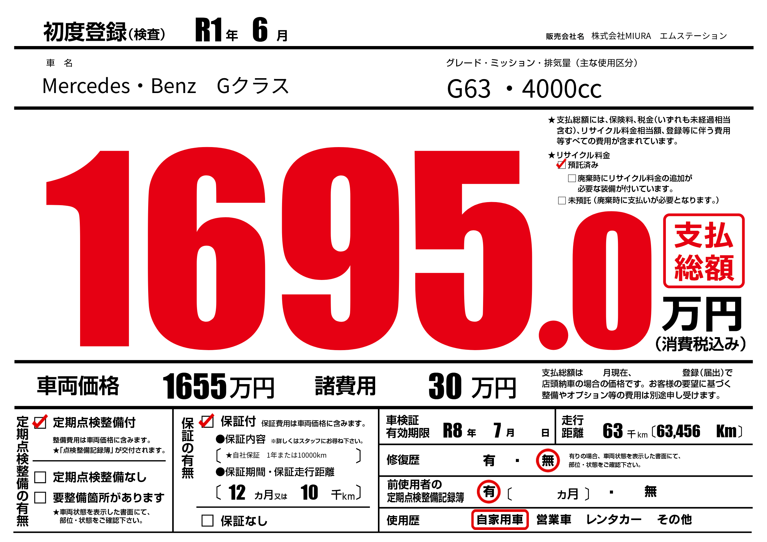 | 走行キロ | 6.3万km | 初年度登録 | R1年6月 |