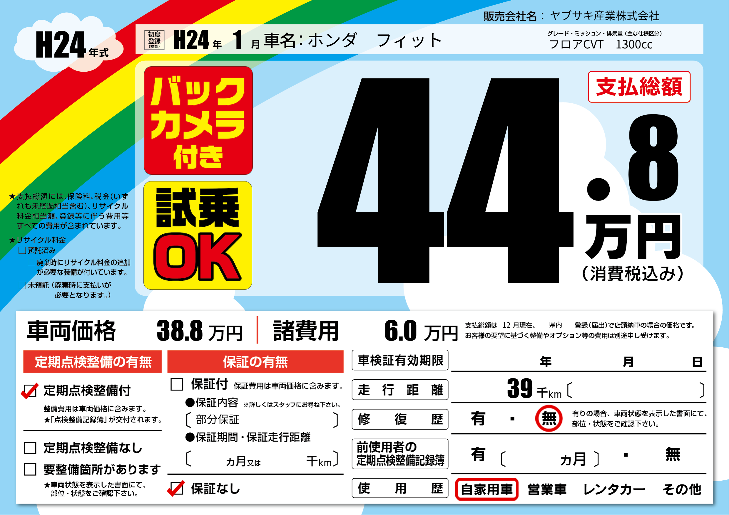 | 走行キロ | 3.9万km | 初年度登録 | H24年1月 |