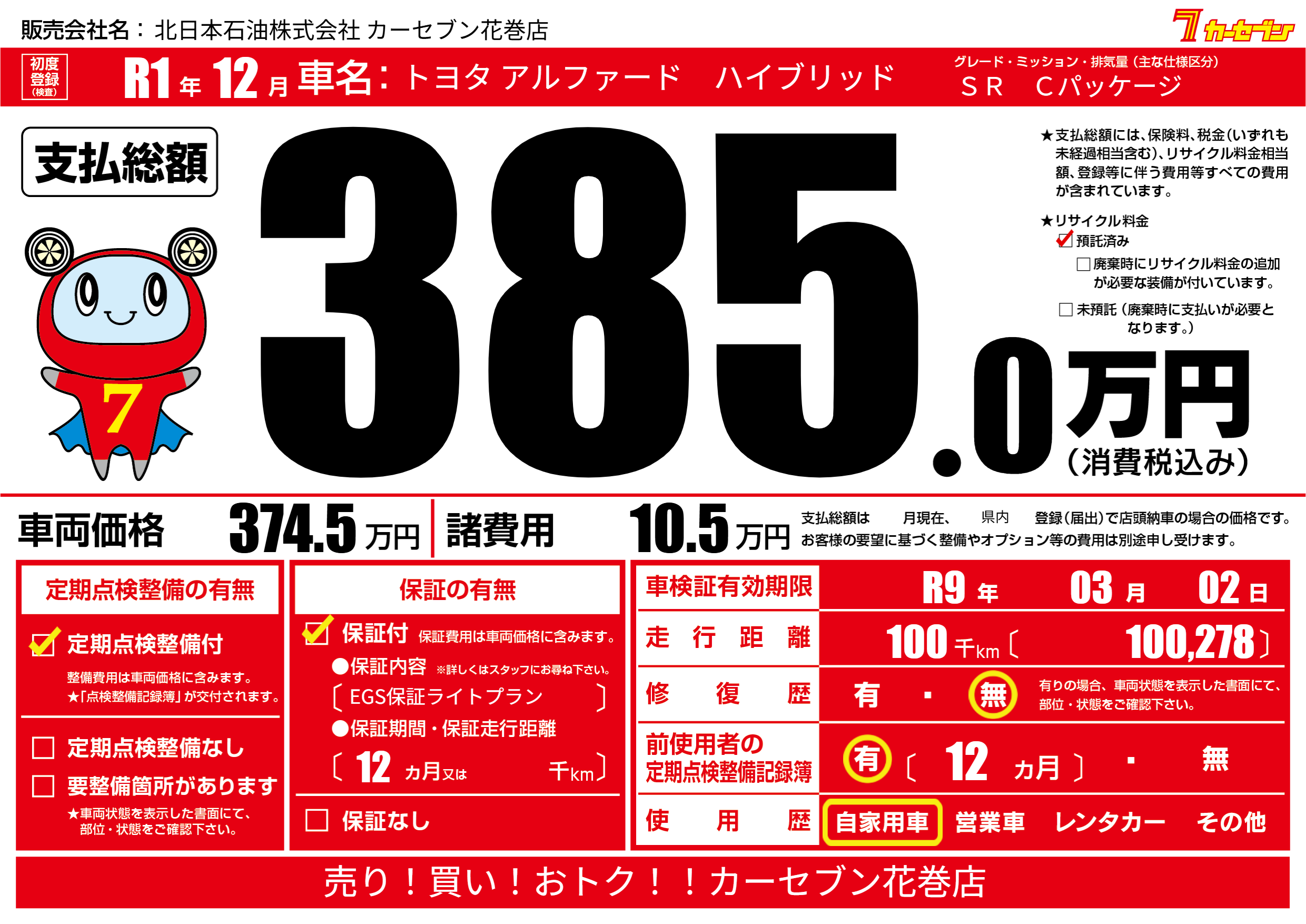 | 走行キロ | 10万km | 初年度登録 | R1年12月 |