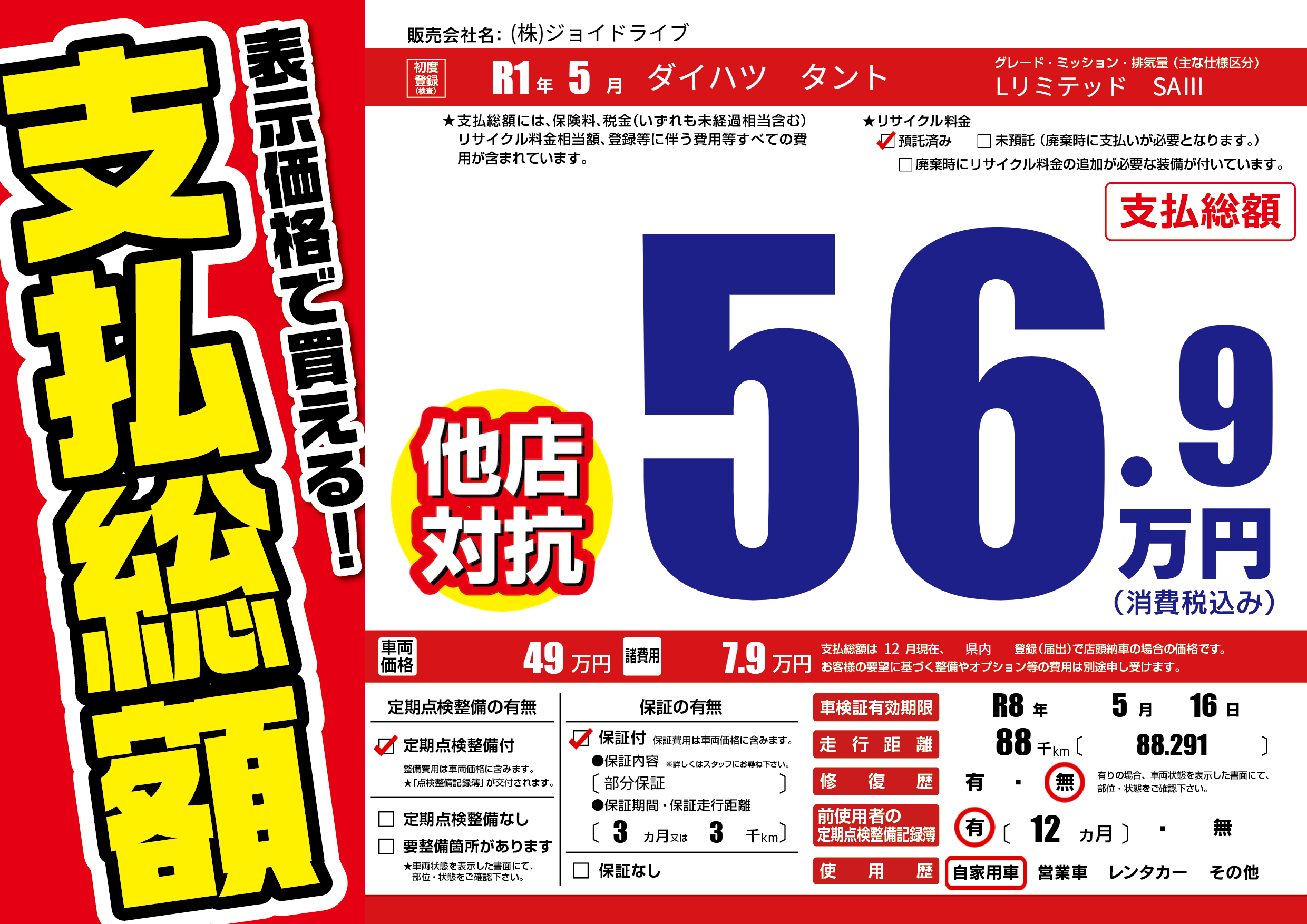 | 車名 | ダイハツ タント | グレード ミッション 排気量 |