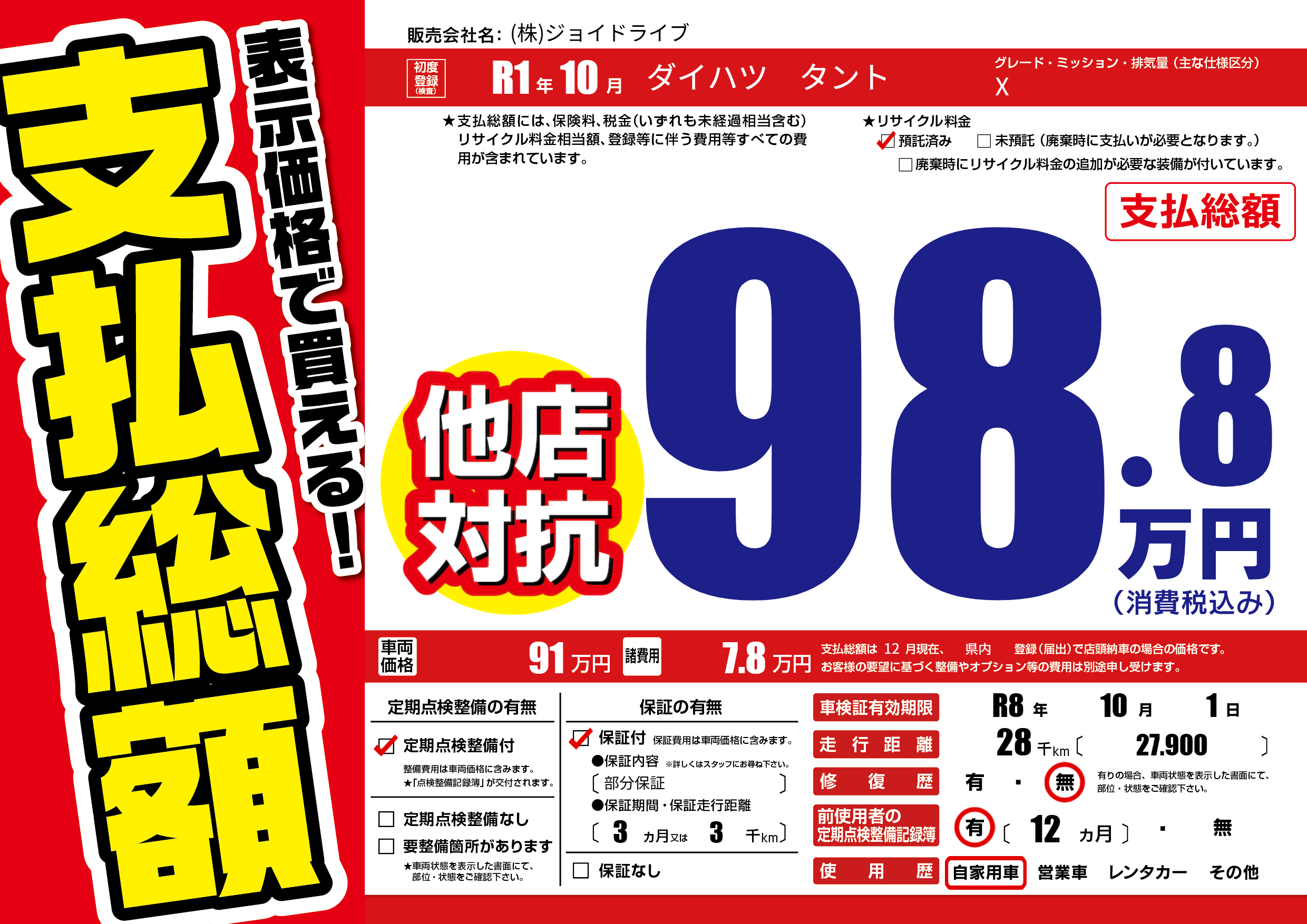 | 車名 | ダイハツ タント | グレード ミッション 排気量 |