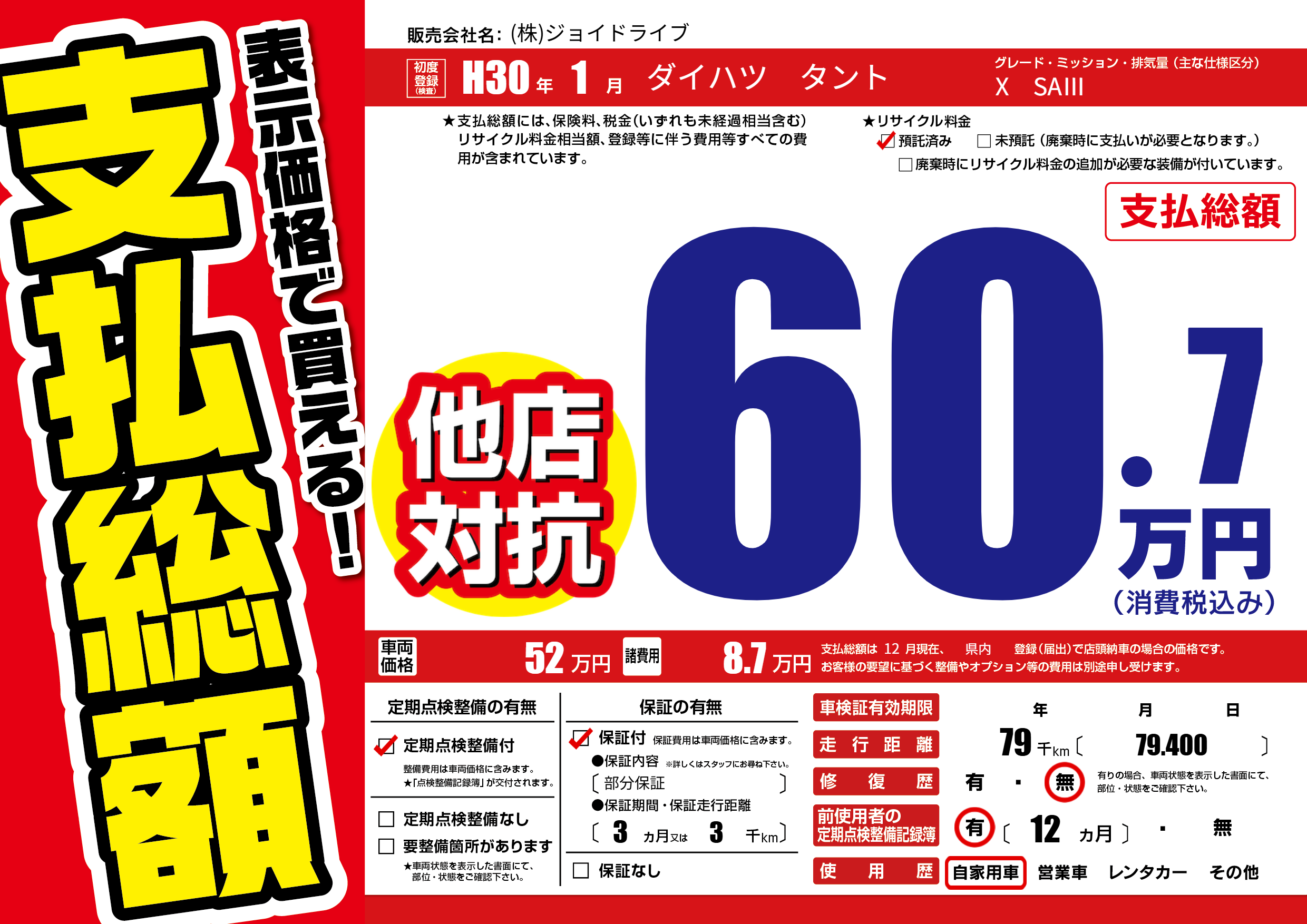 保証付き 保証内容(部分保証) 3ヶ月または(3)千kmまで |