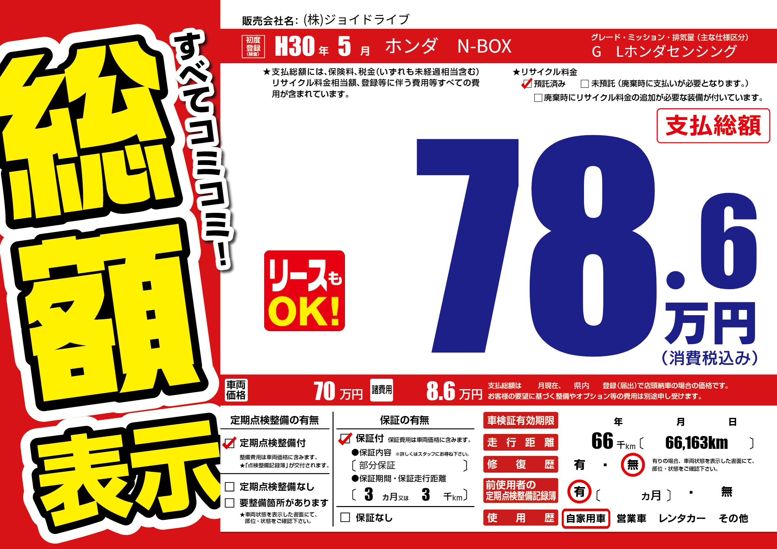 | 走行キロ | 6.6万km | 初年度登録 | H30年5月 |