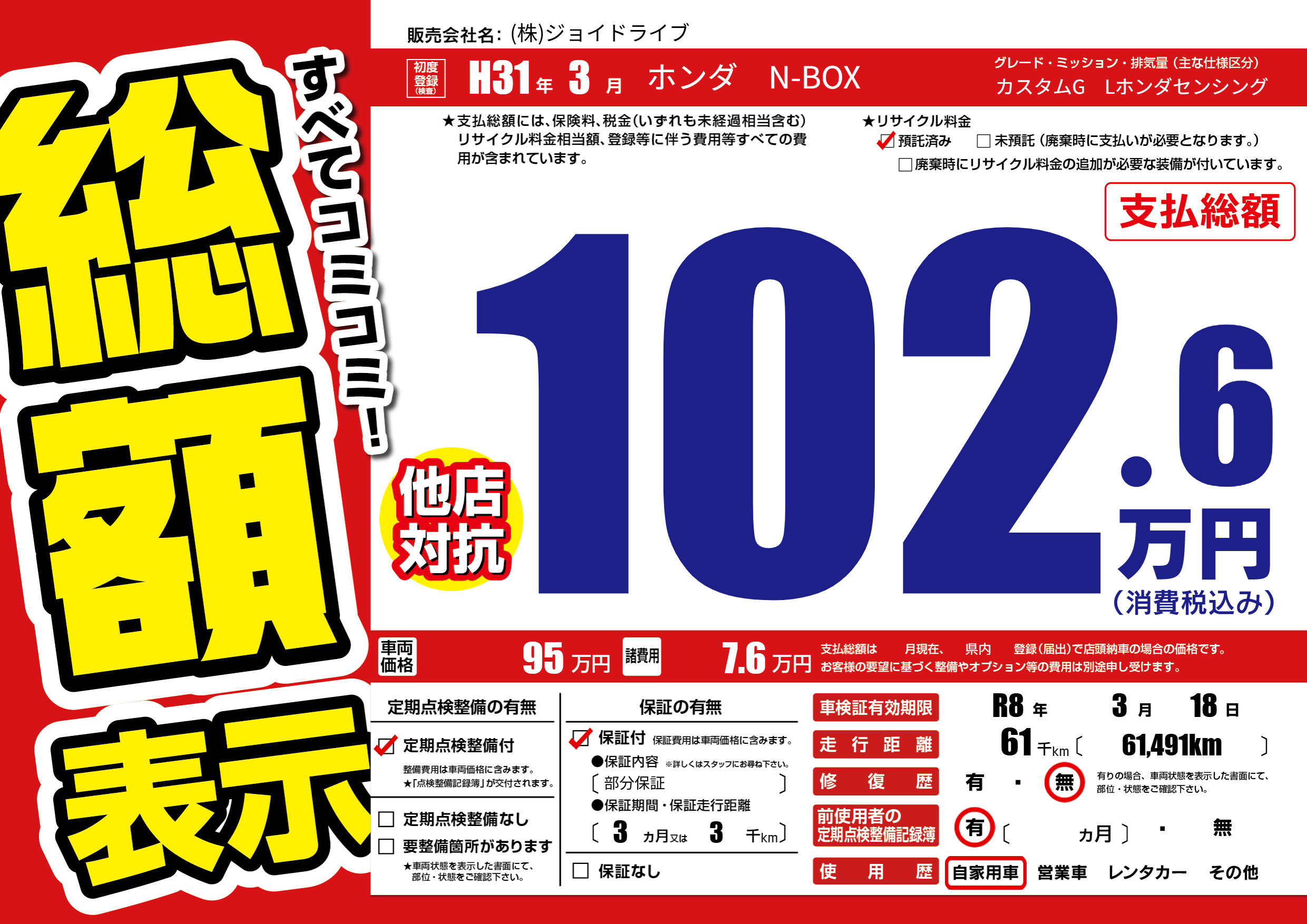 | 走行キロ | 6.1万km | 初年度登録 | H31年3月 |