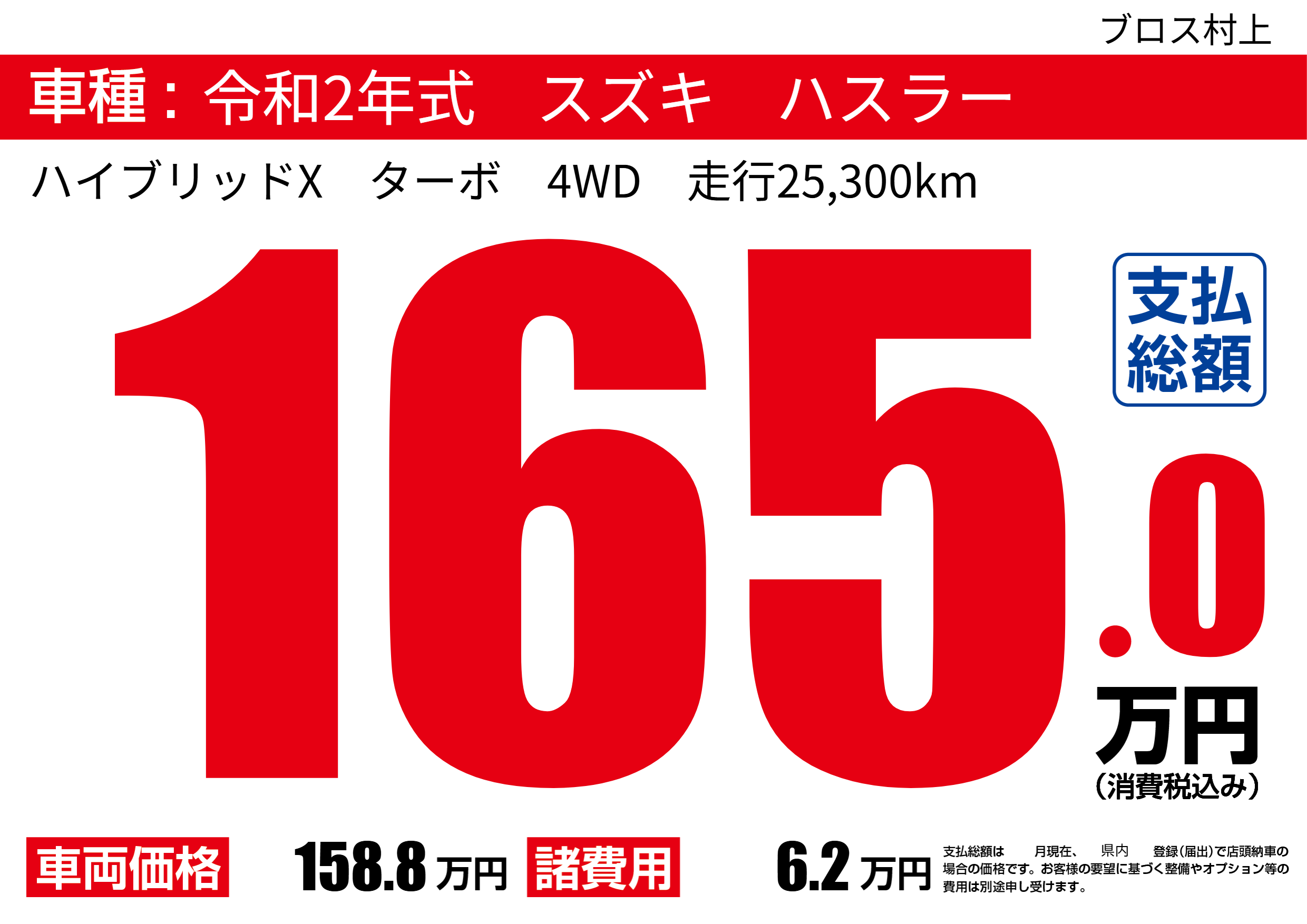 | 車名 | 令和2年式 スズキ ハスラー | グレード ミッション 排気量 |