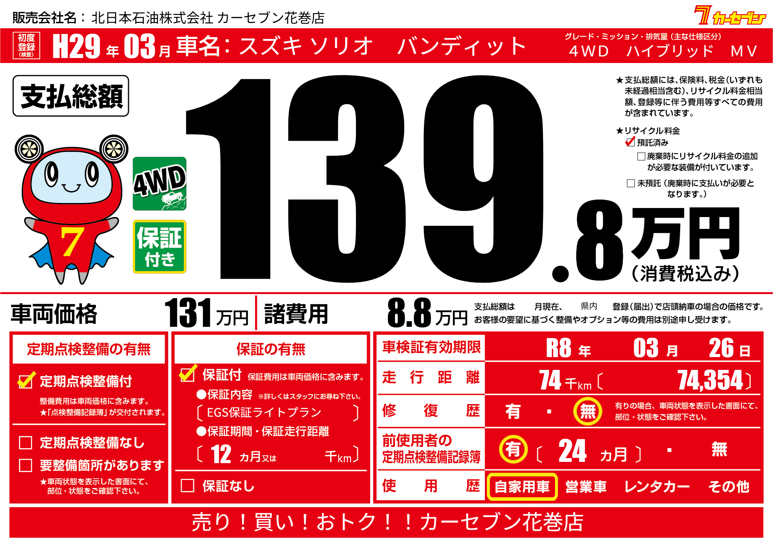 | 走行キロ | 7.4万km | 初年度登録 | H29年03月 |