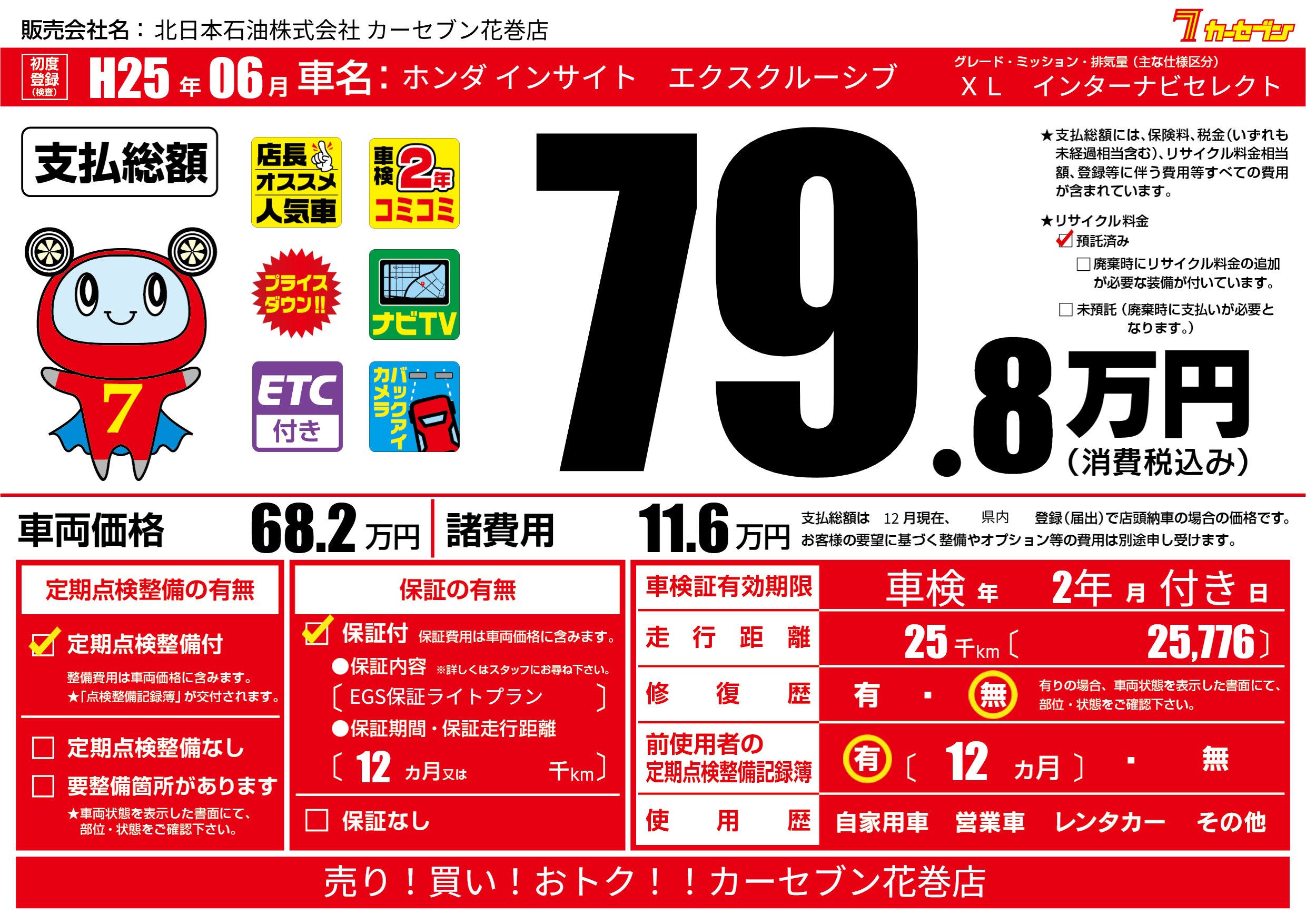 | 車名 | ホンダ インサイト エクスクルーシブ | グレード ミッション 排気量 |