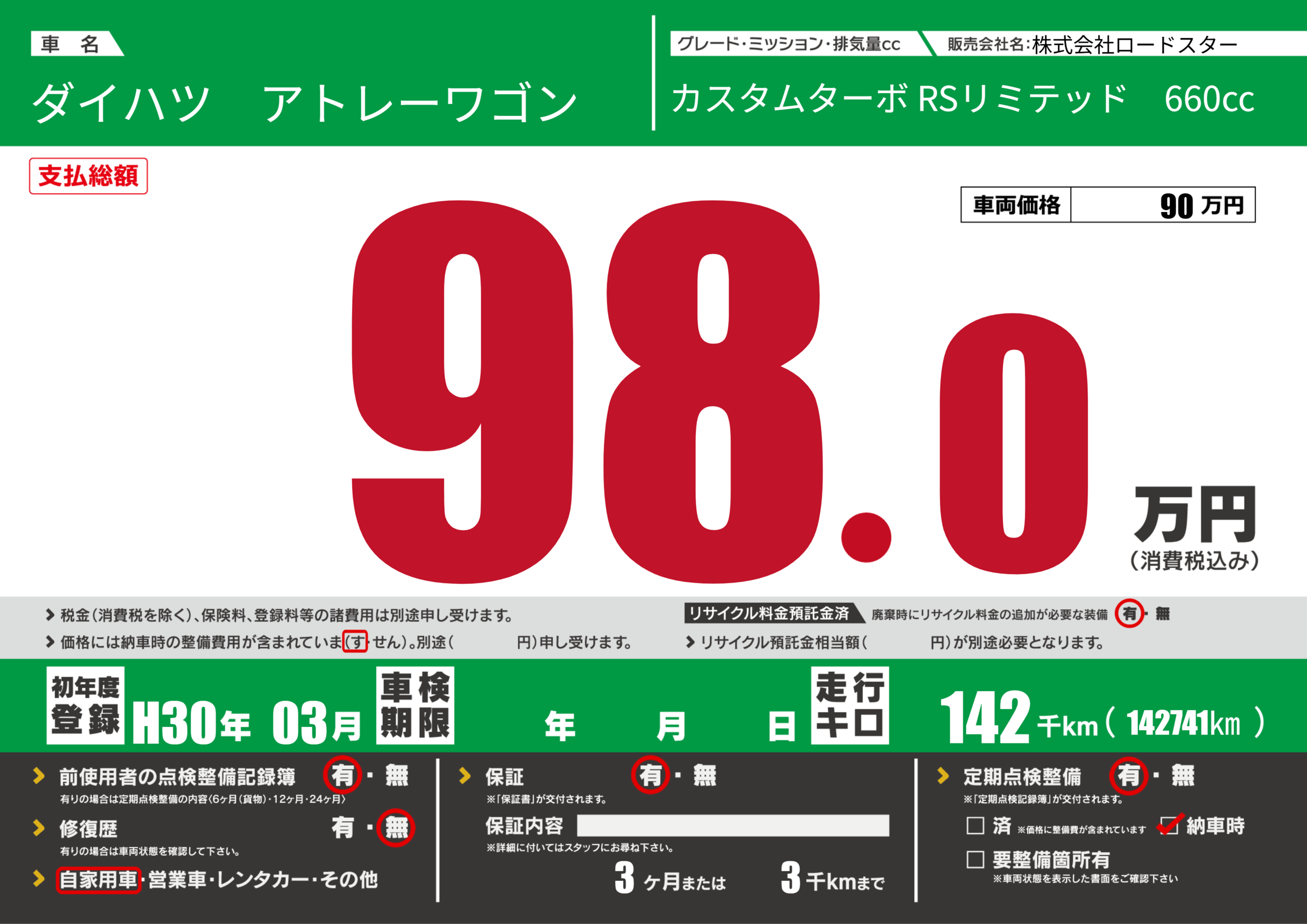 保証付き 保証内容(---) 3ヶ月または(3)千kmまで |