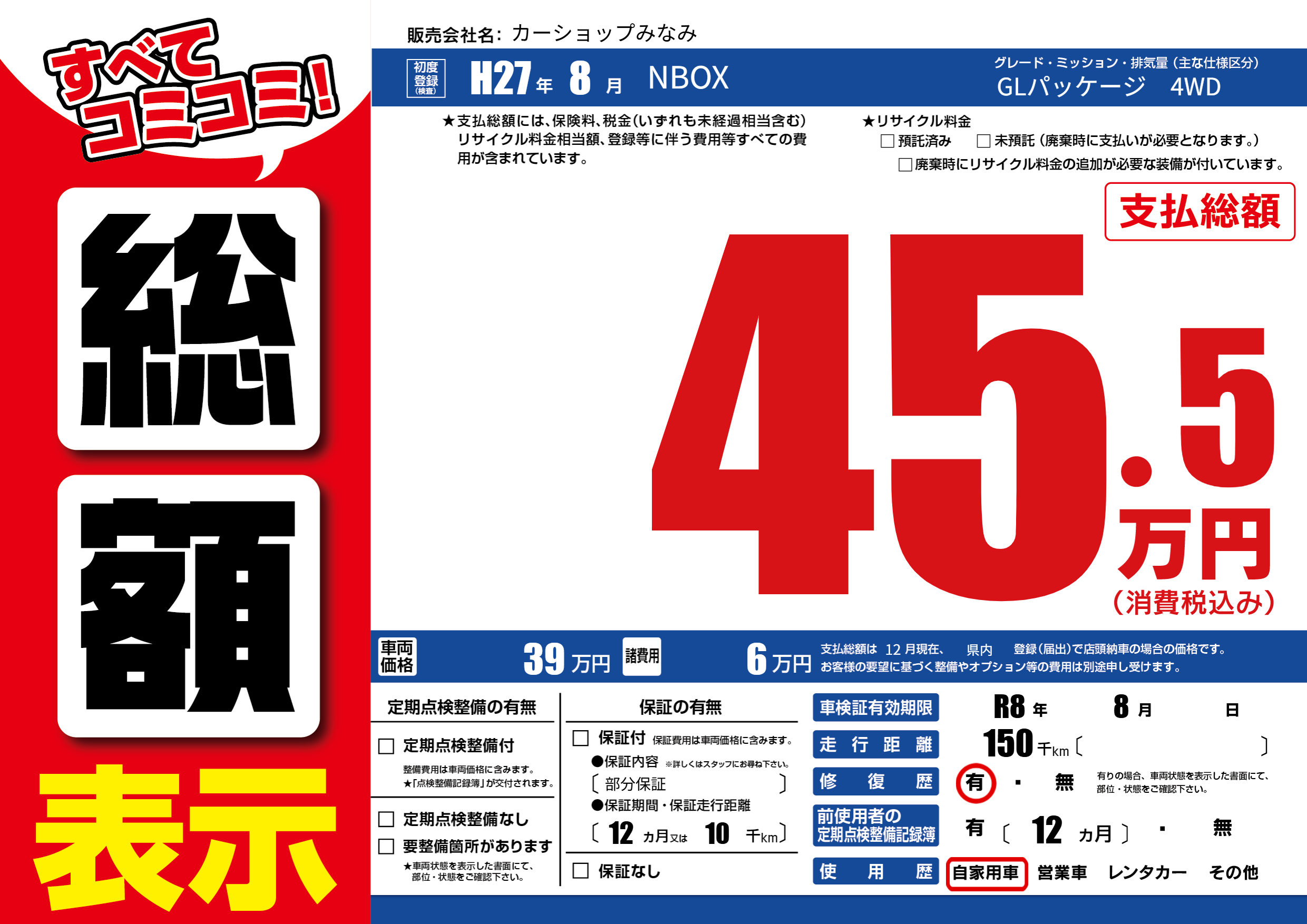 | 走行キロ | 15万km | 初年度登録 | H27年8月 |