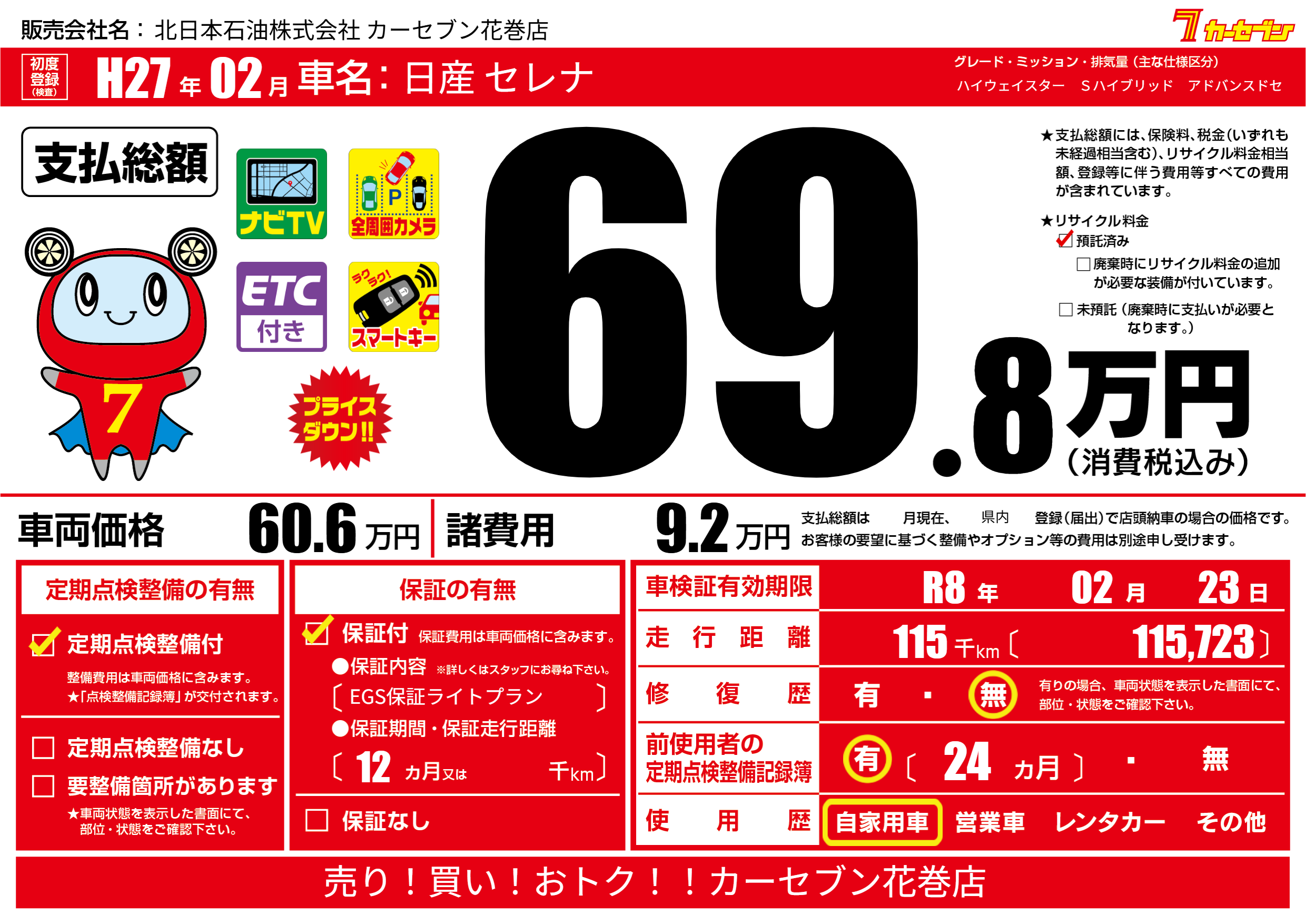 | 走行キロ | 11.5万km | 初年度登録 | H27年02月 |