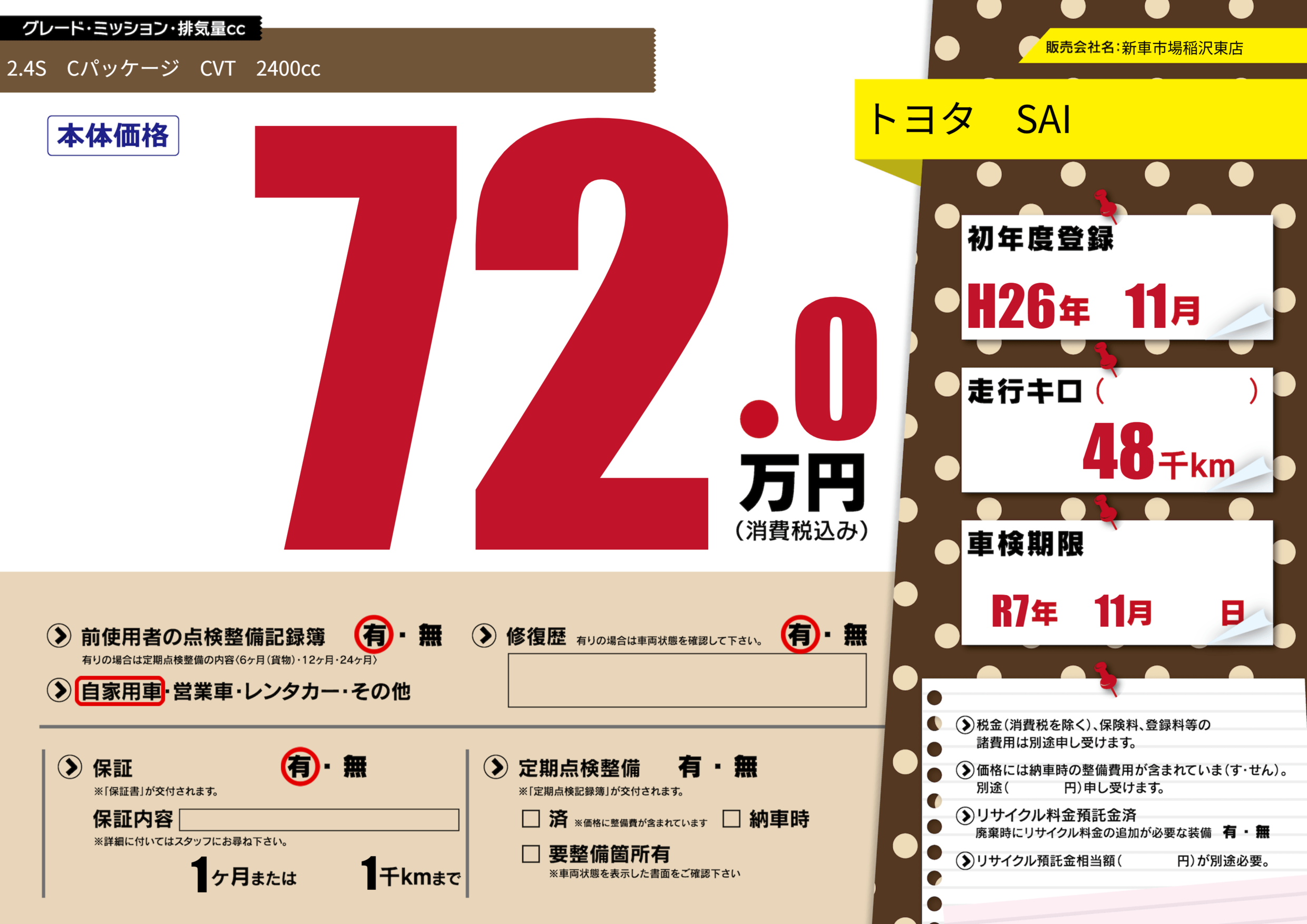 | 車名 | トヨタ SAI | グレード ミッション 排気量 |