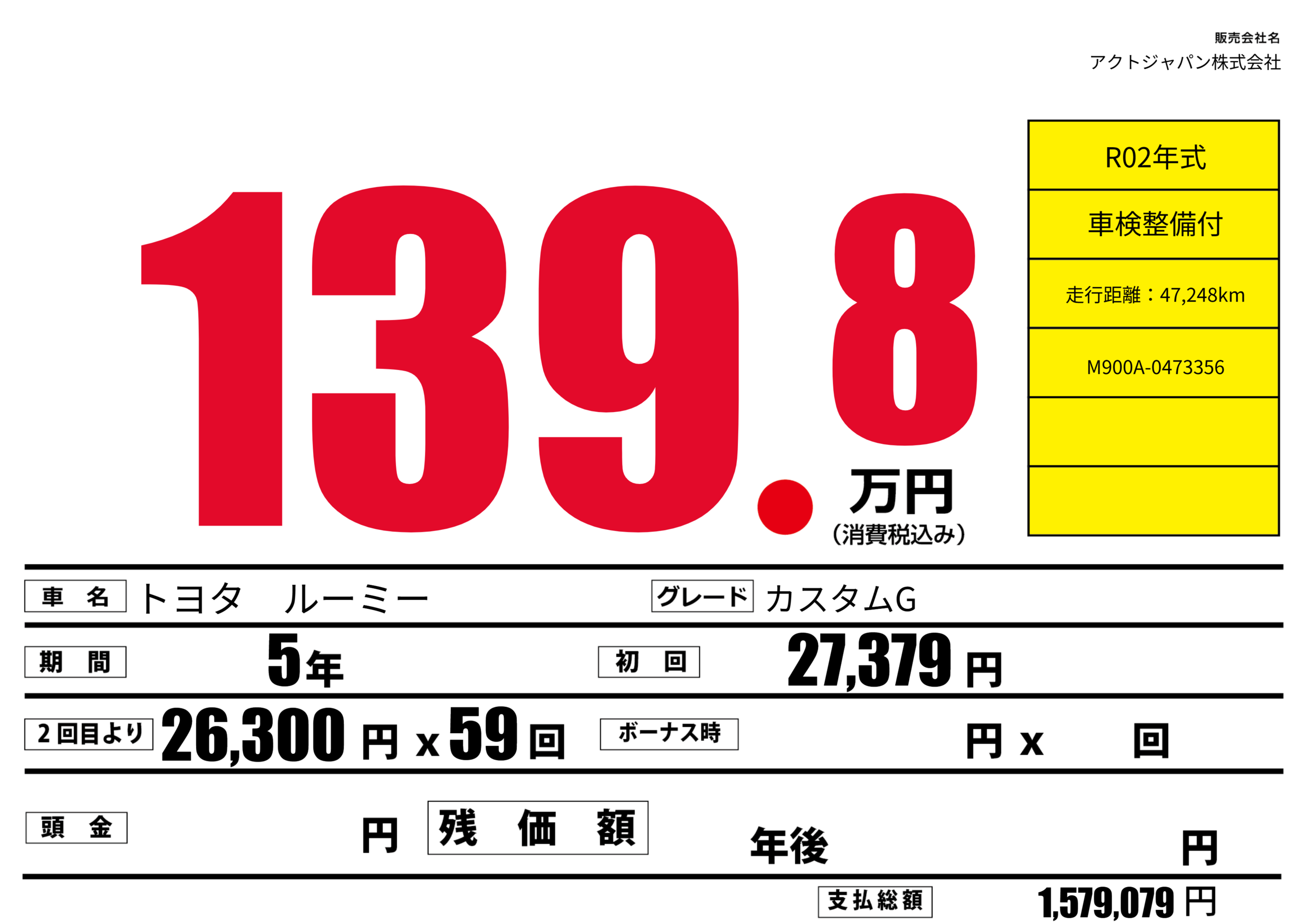 | 車名 | トヨタ ルーミー | グレード ミッション 排気量 |