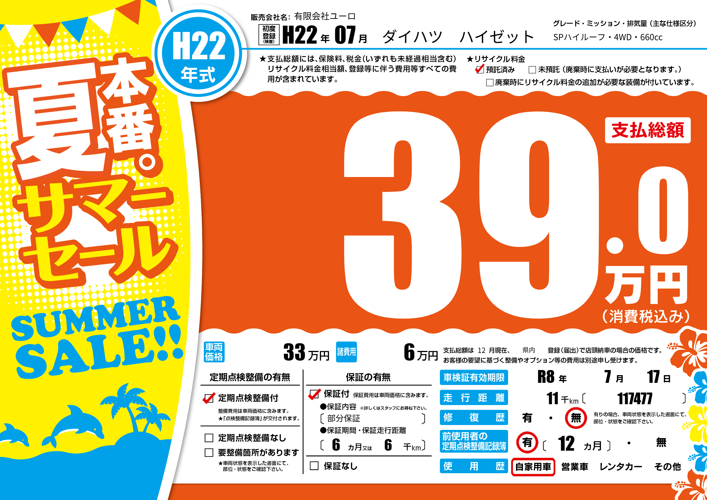 | 走行キロ | 1.1万km | 初年度登録 | H22年07月 |