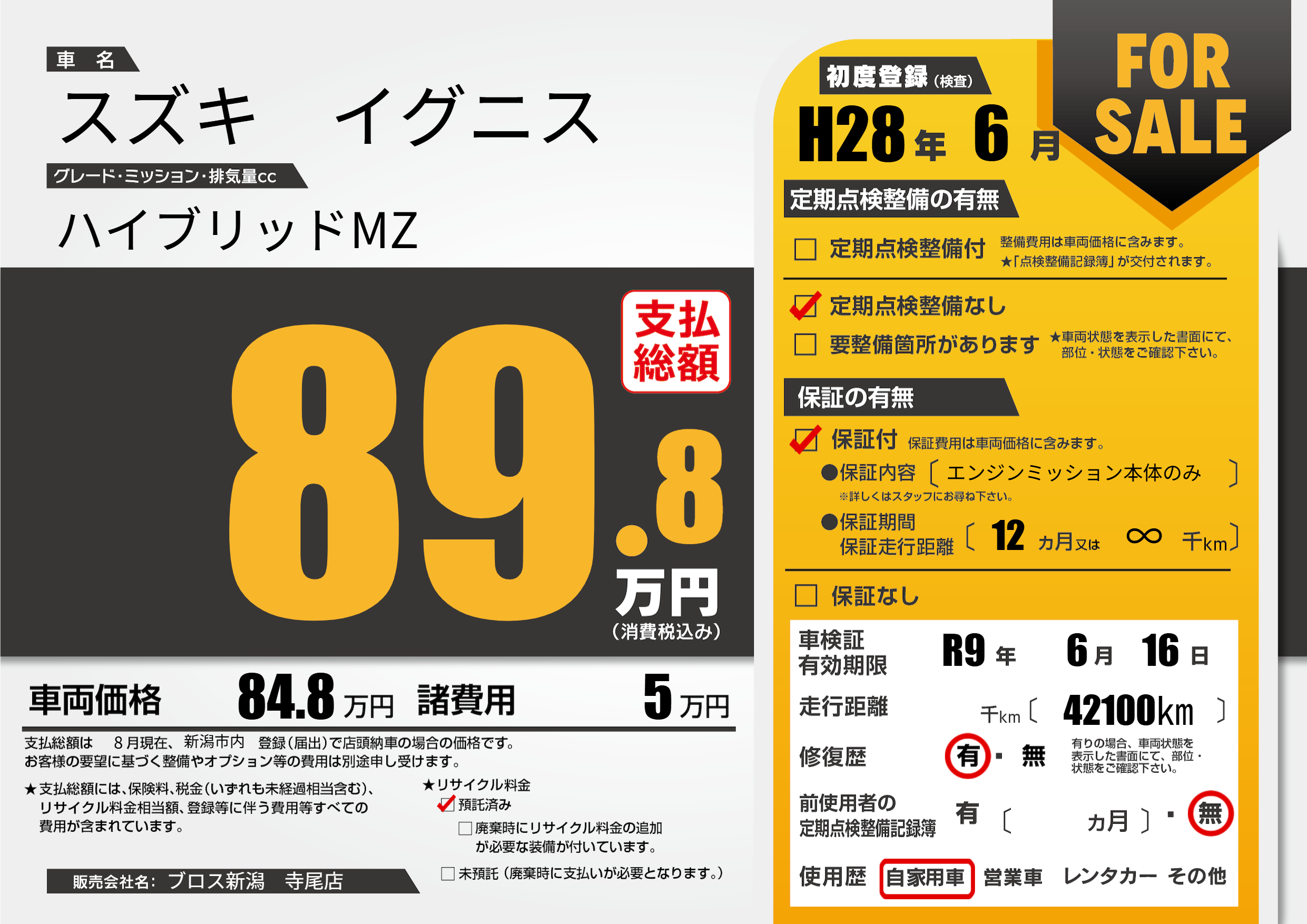 | 車名 | スズキ イグニス | グレード ミッション 排気量 |