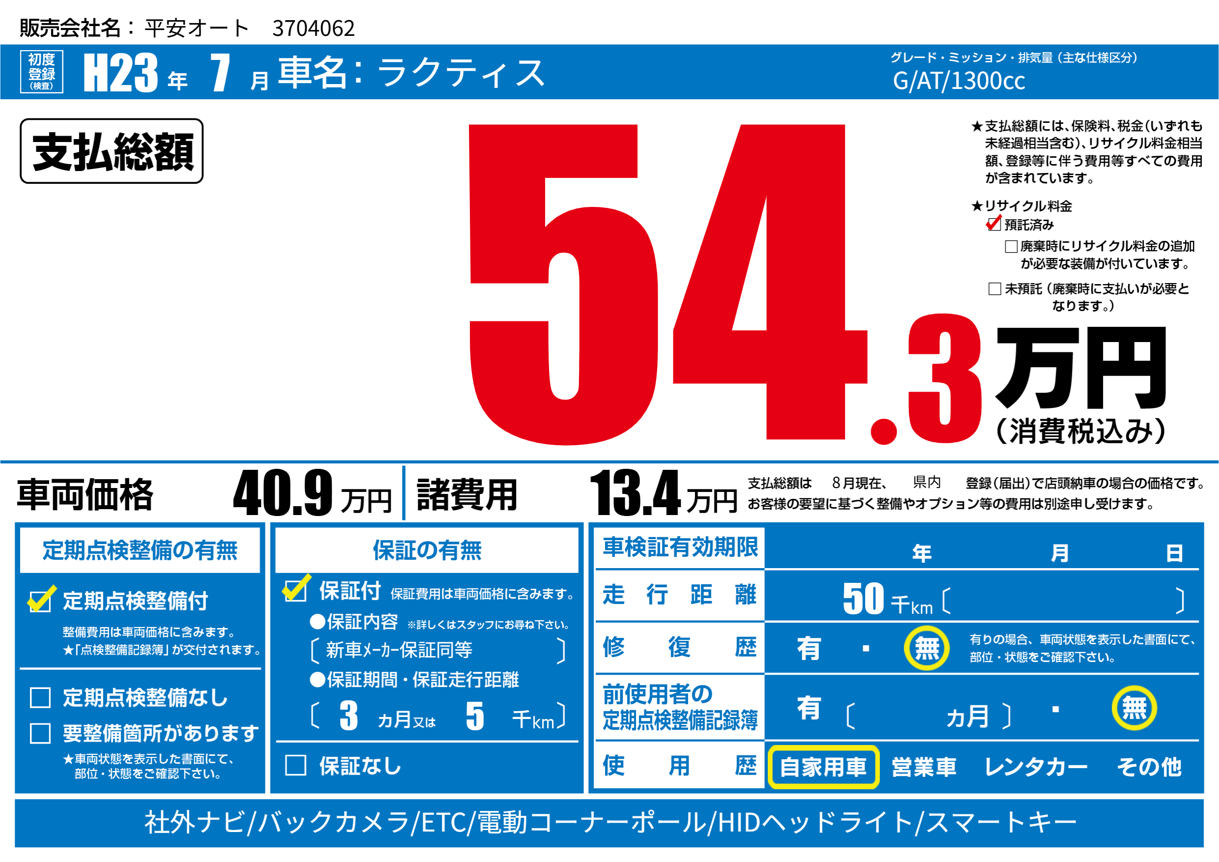 | 走行キロ | 5万km | 初年度登録 | H23年7月 |