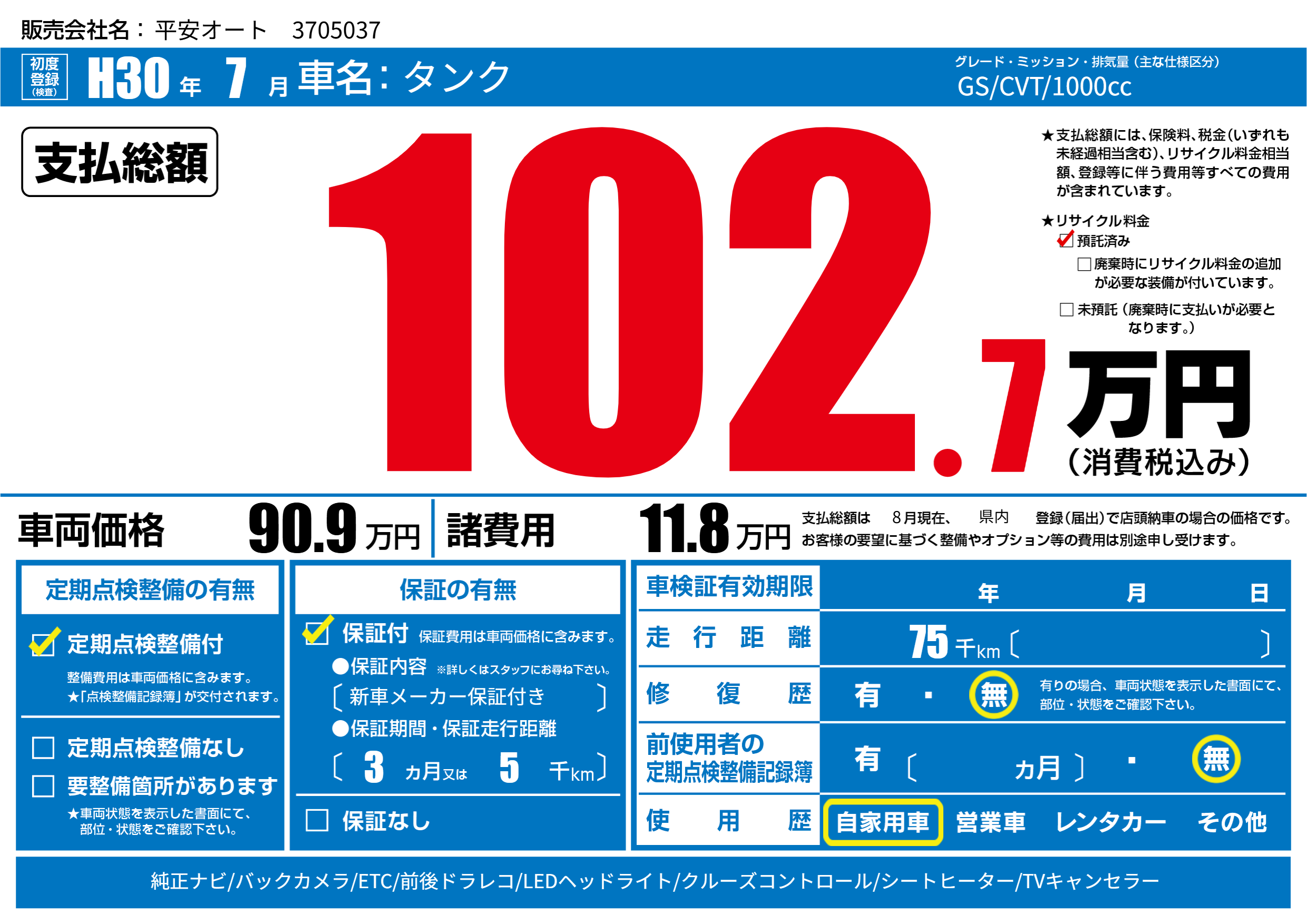 | 走行キロ | 7.5万km | 初年度登録 | H30年7月 |
