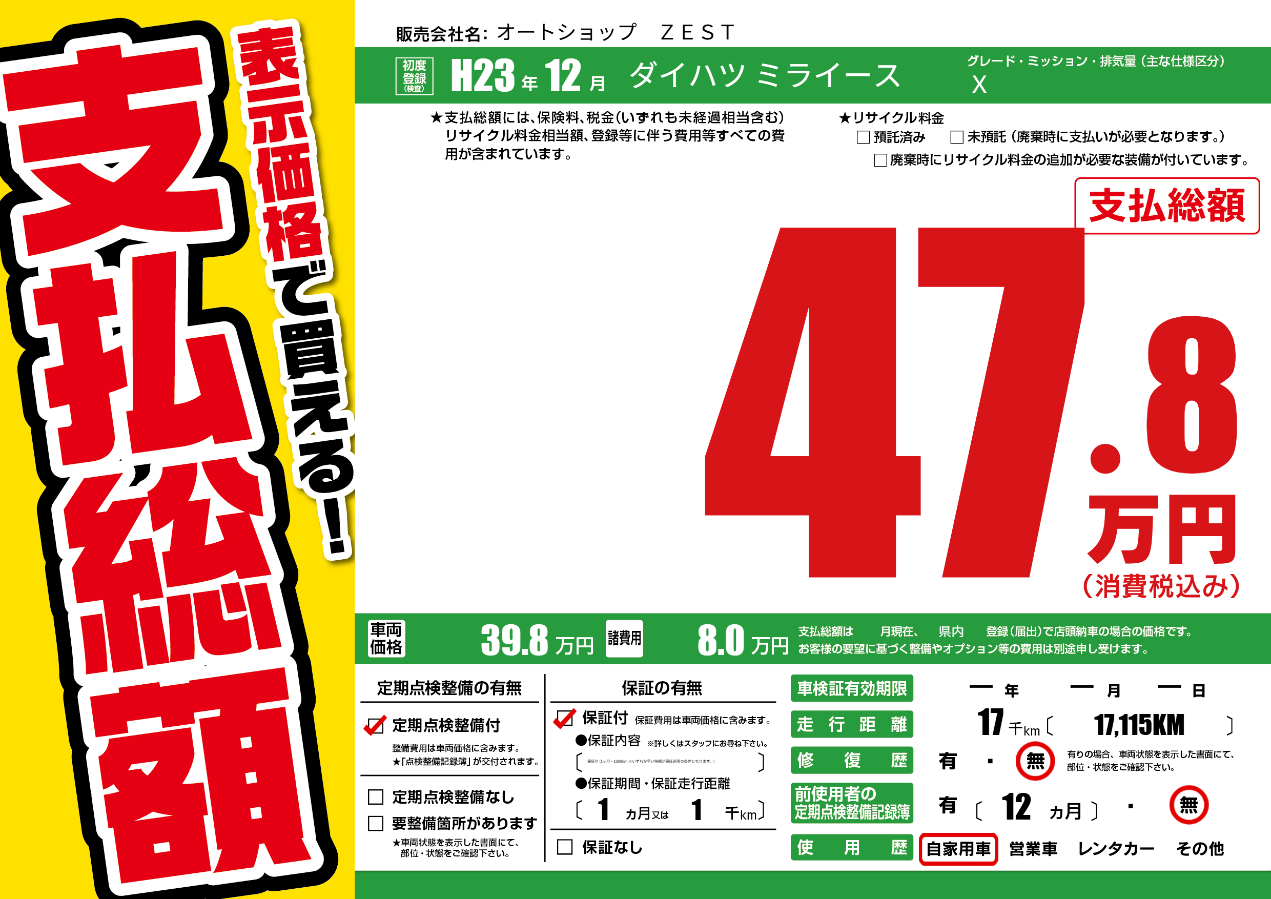 | 走行キロ | 1.7万km | 初年度登録 | H23年12月 |