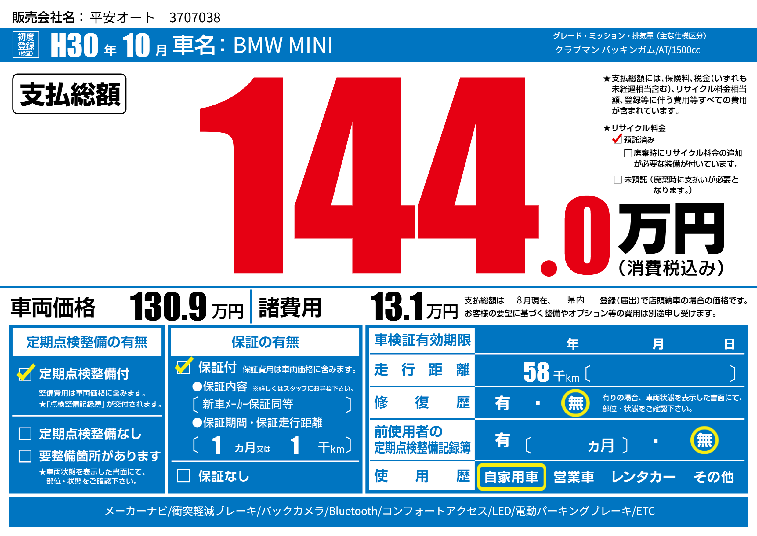 | 初年度登録 | H30年10月 | ||