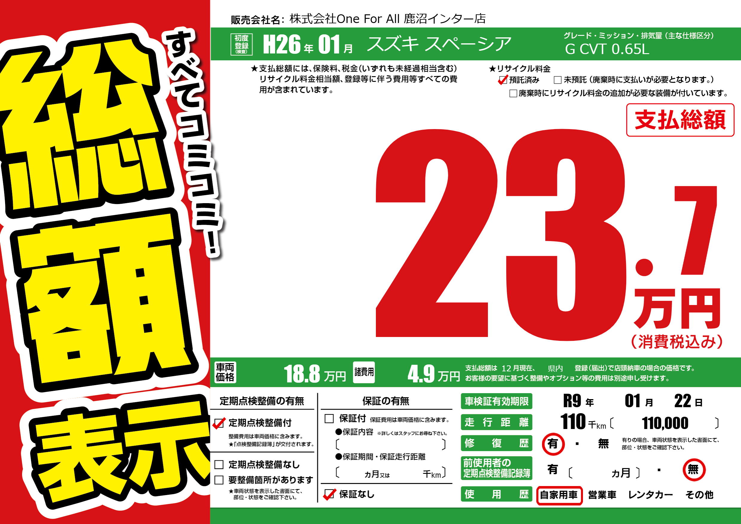 | 走行キロ | 11万km | 初年度登録 | H26年01月 |