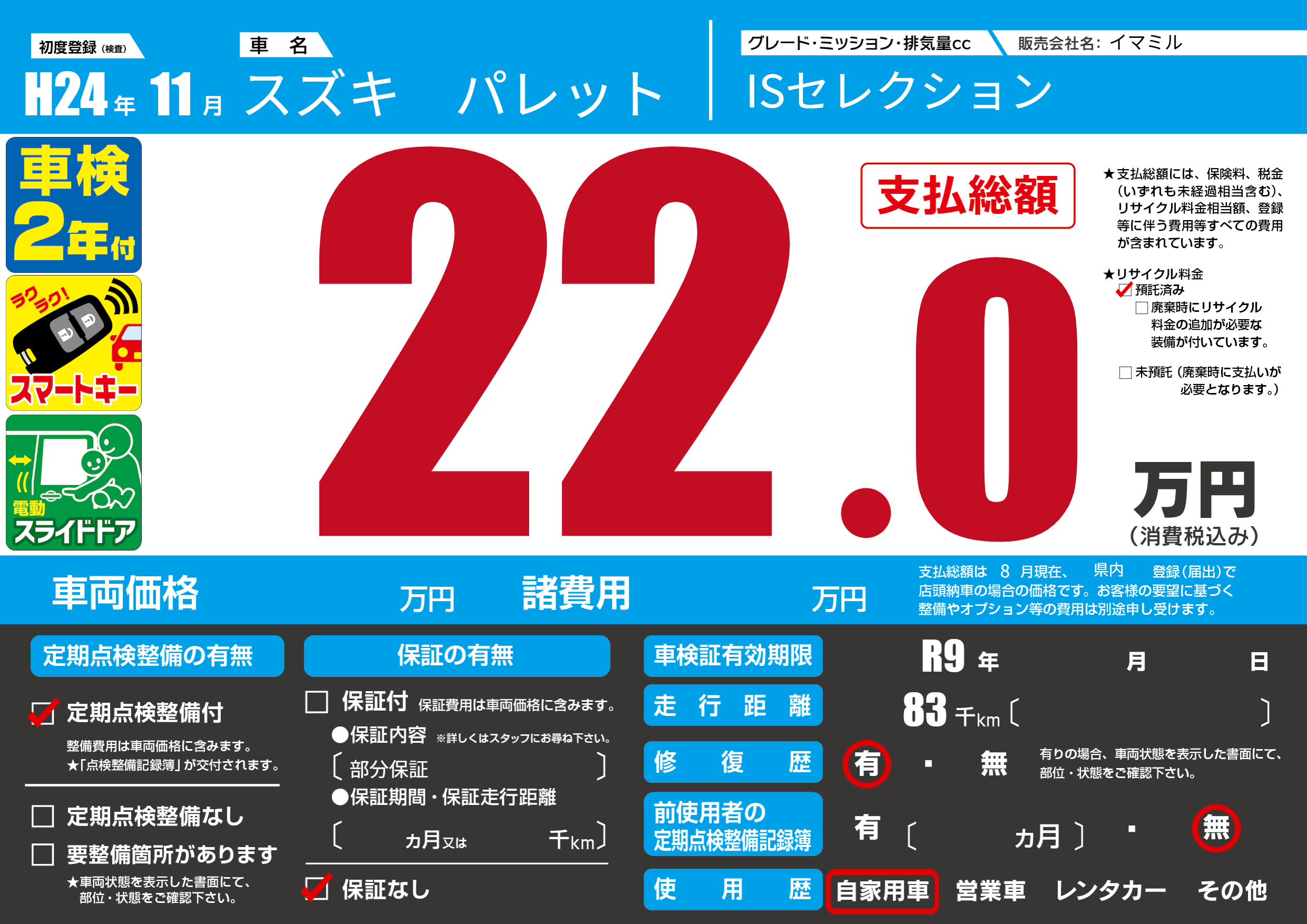 | 車名 | スズキ パレット | グレード ミッション 排気量 |
