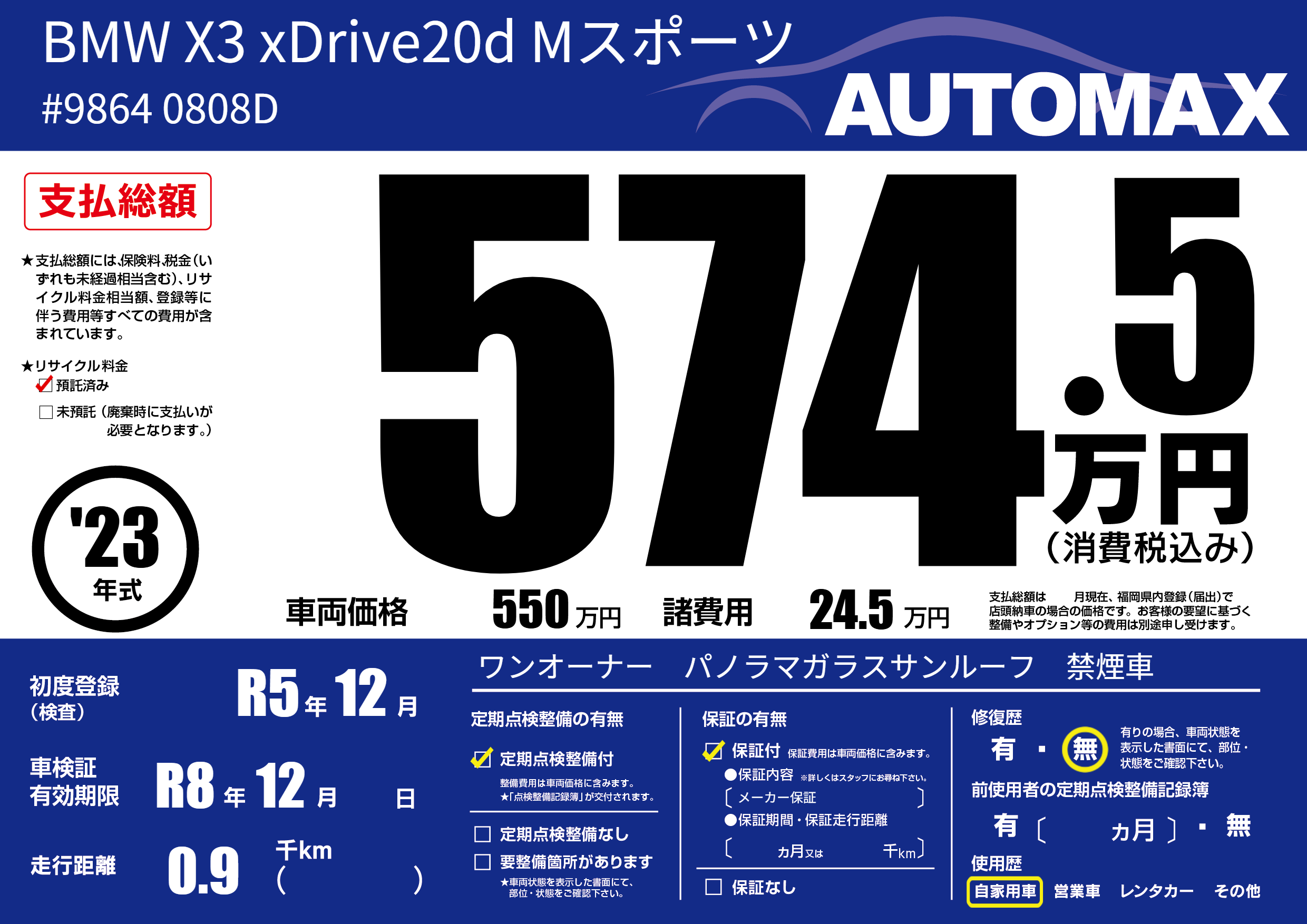 | 車名 | BMW X3 xDrive20d Mスポーツ | グレード ミッション 排気量 |
