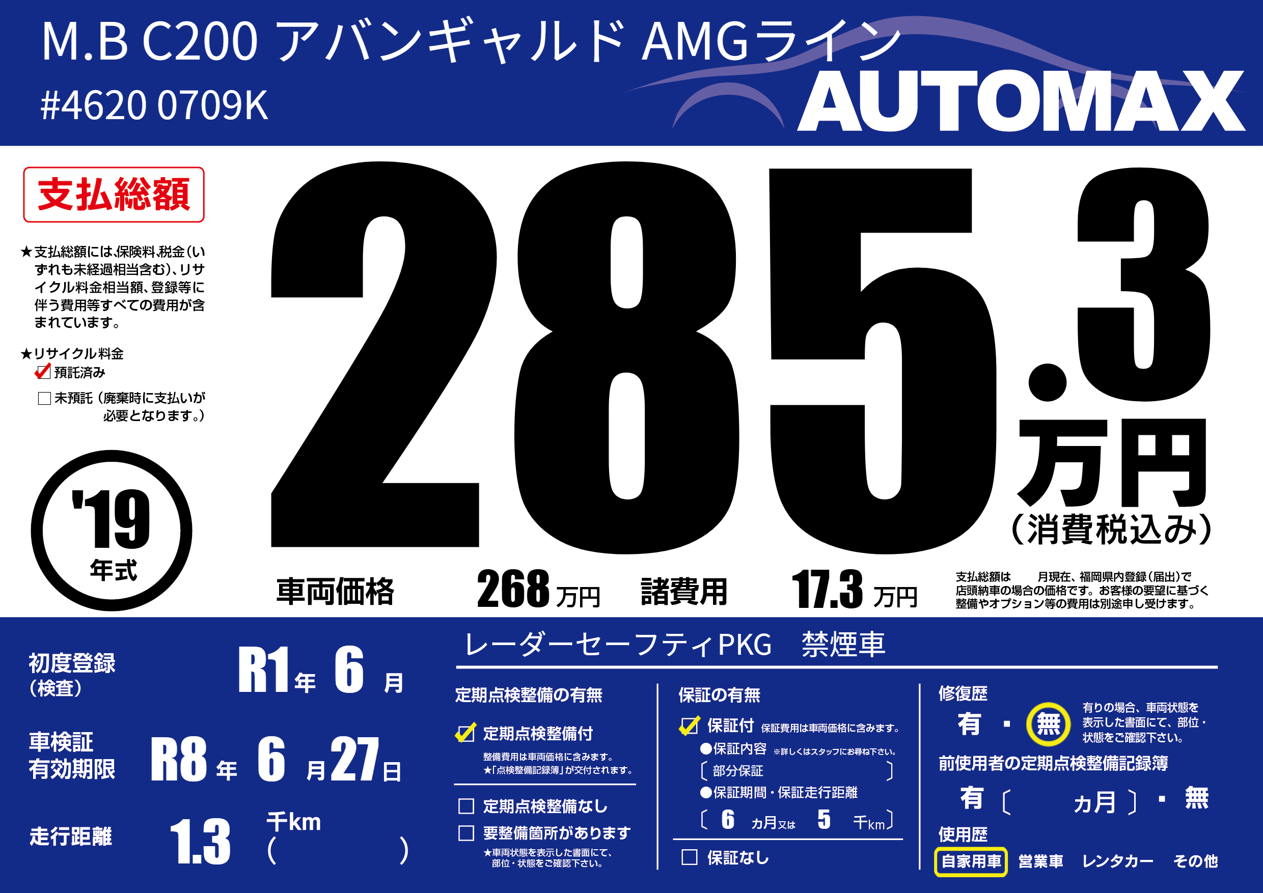 | 車名 | M.B C200 アバンギャルド AMGライン | グレード ミッション 排気量 |