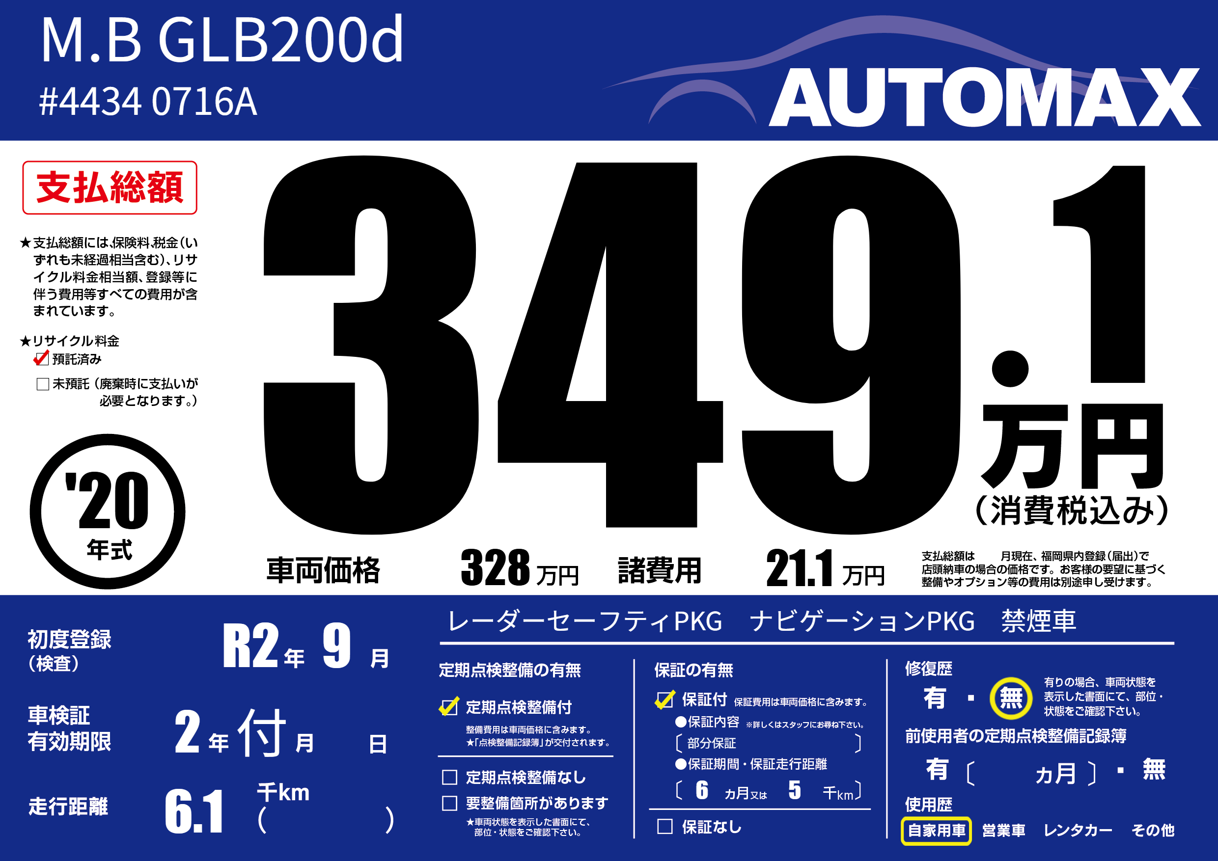 | 車名 | M.B GLB200d | グレード ミッション 排気量 |