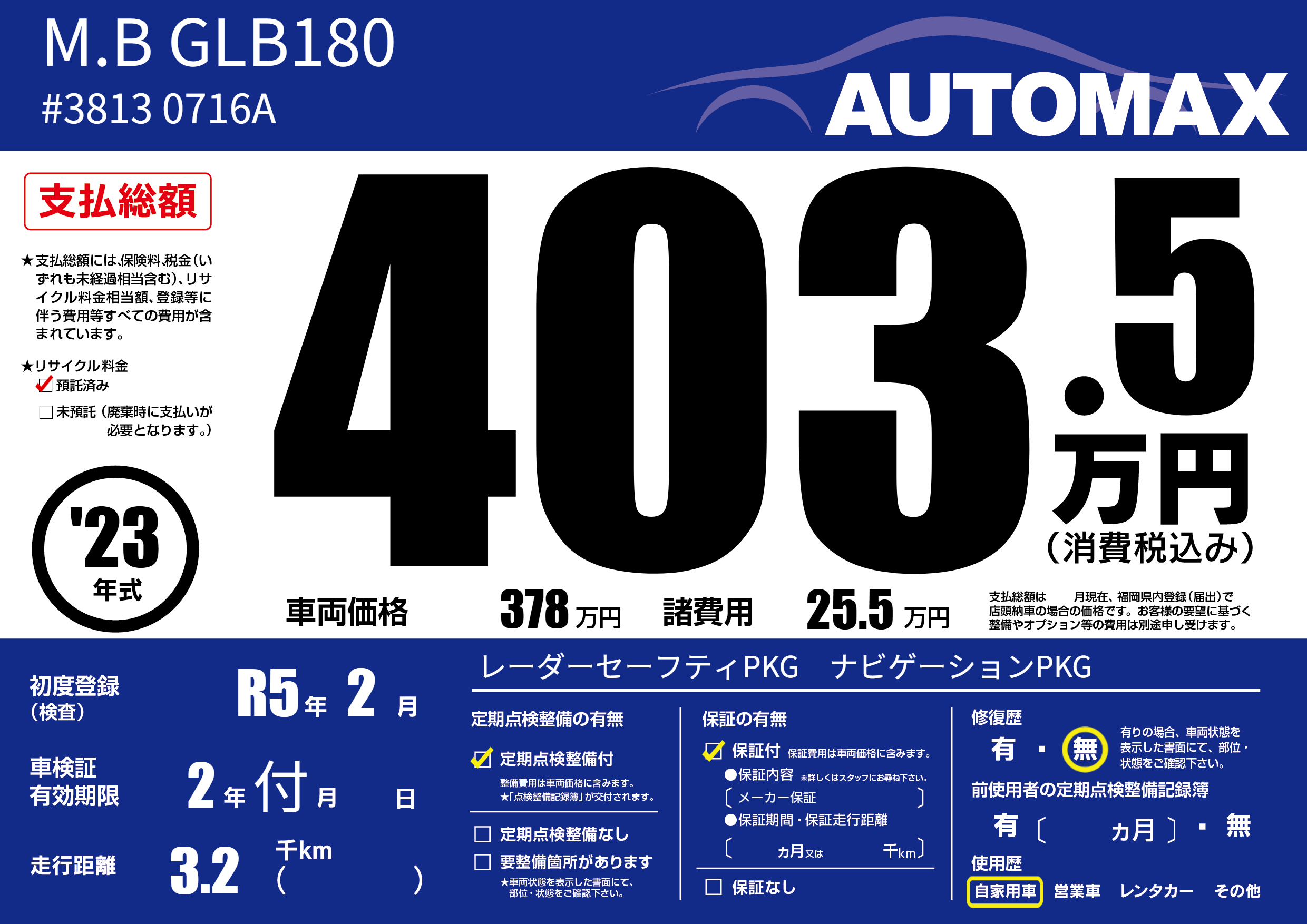 | 車名 | M.B GLB180 | グレード ミッション 排気量 |
