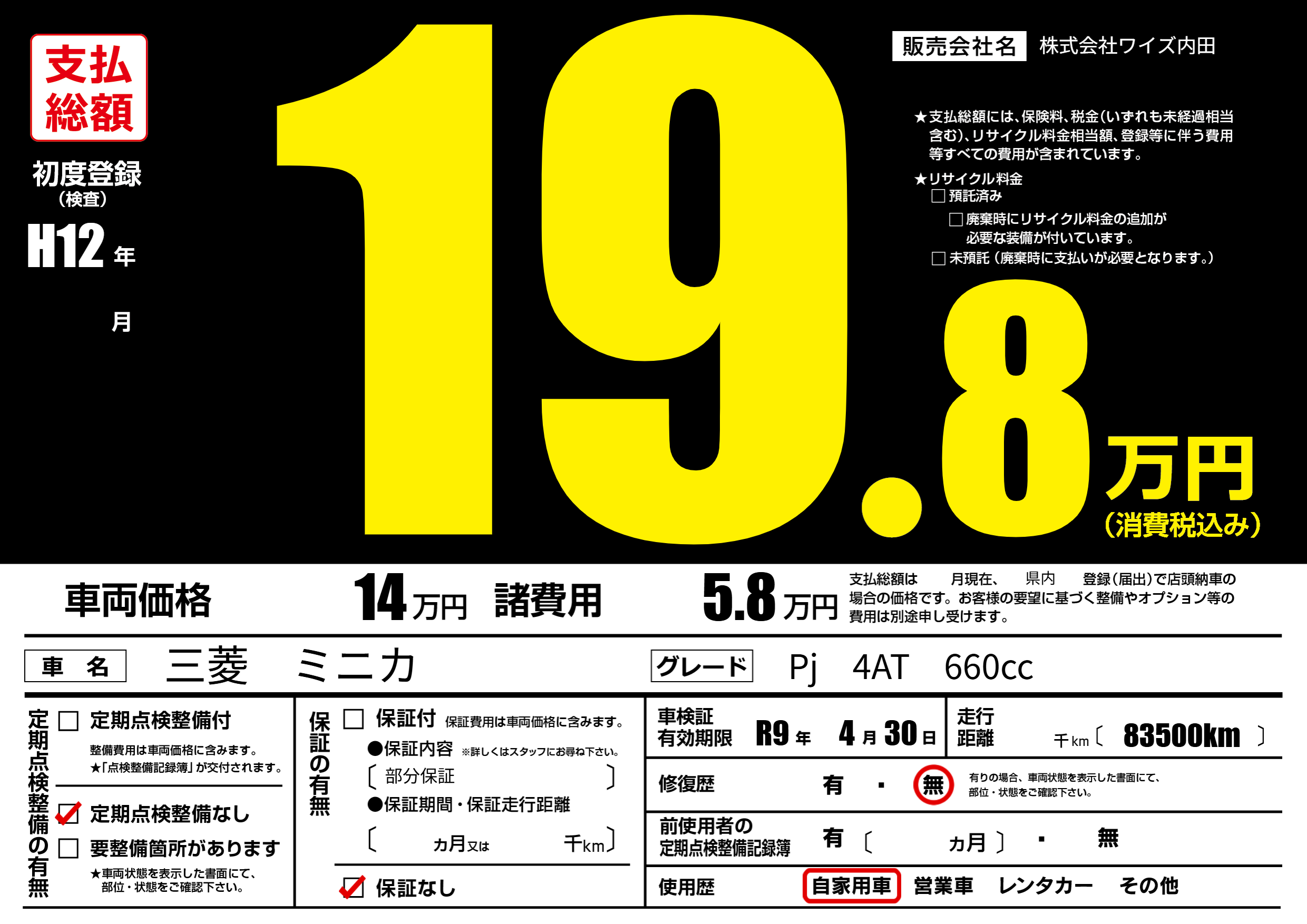 | 車名 | 三菱 ミニカ | グレード ミッション 排気量 |