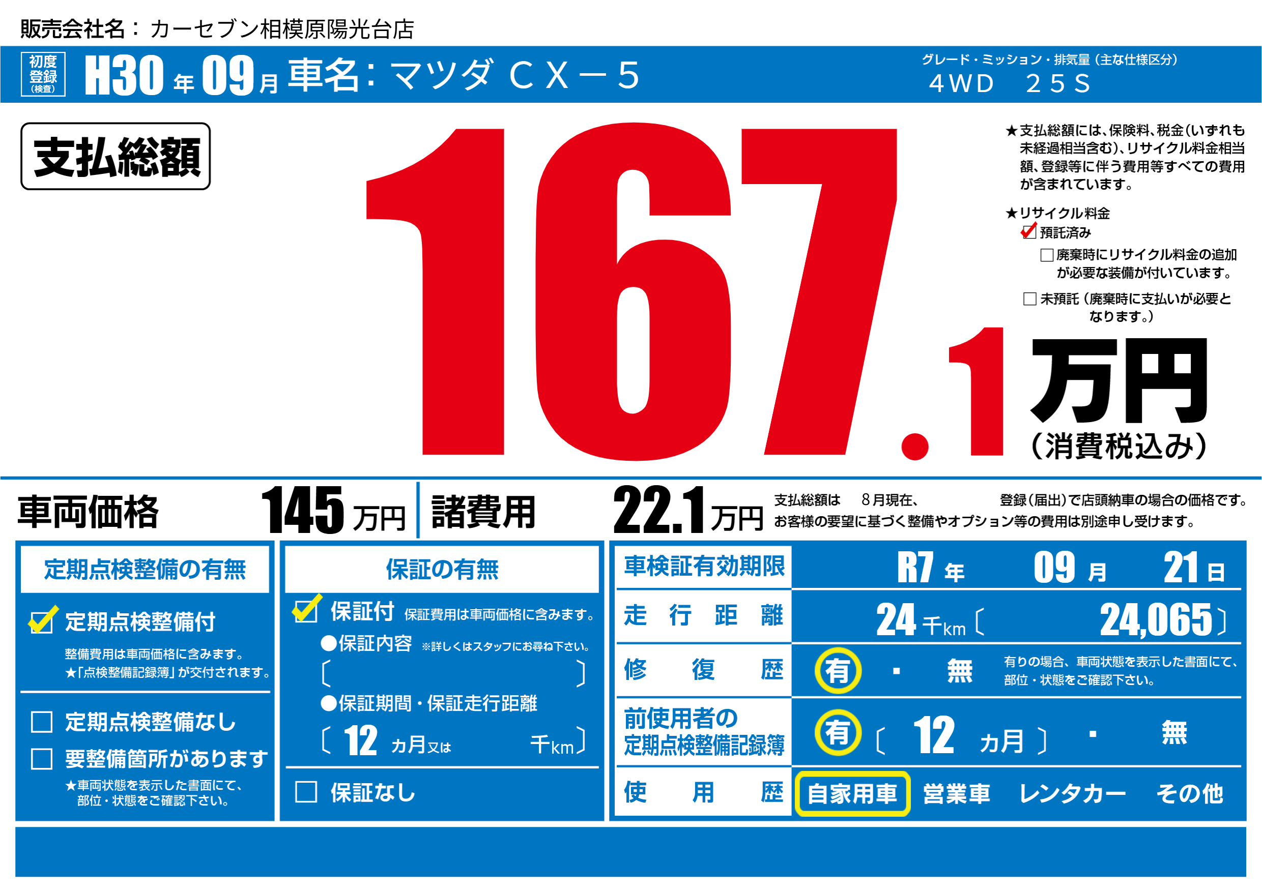 | 車名 | マツダ CX-5 | グレード ミッション 排気量 |