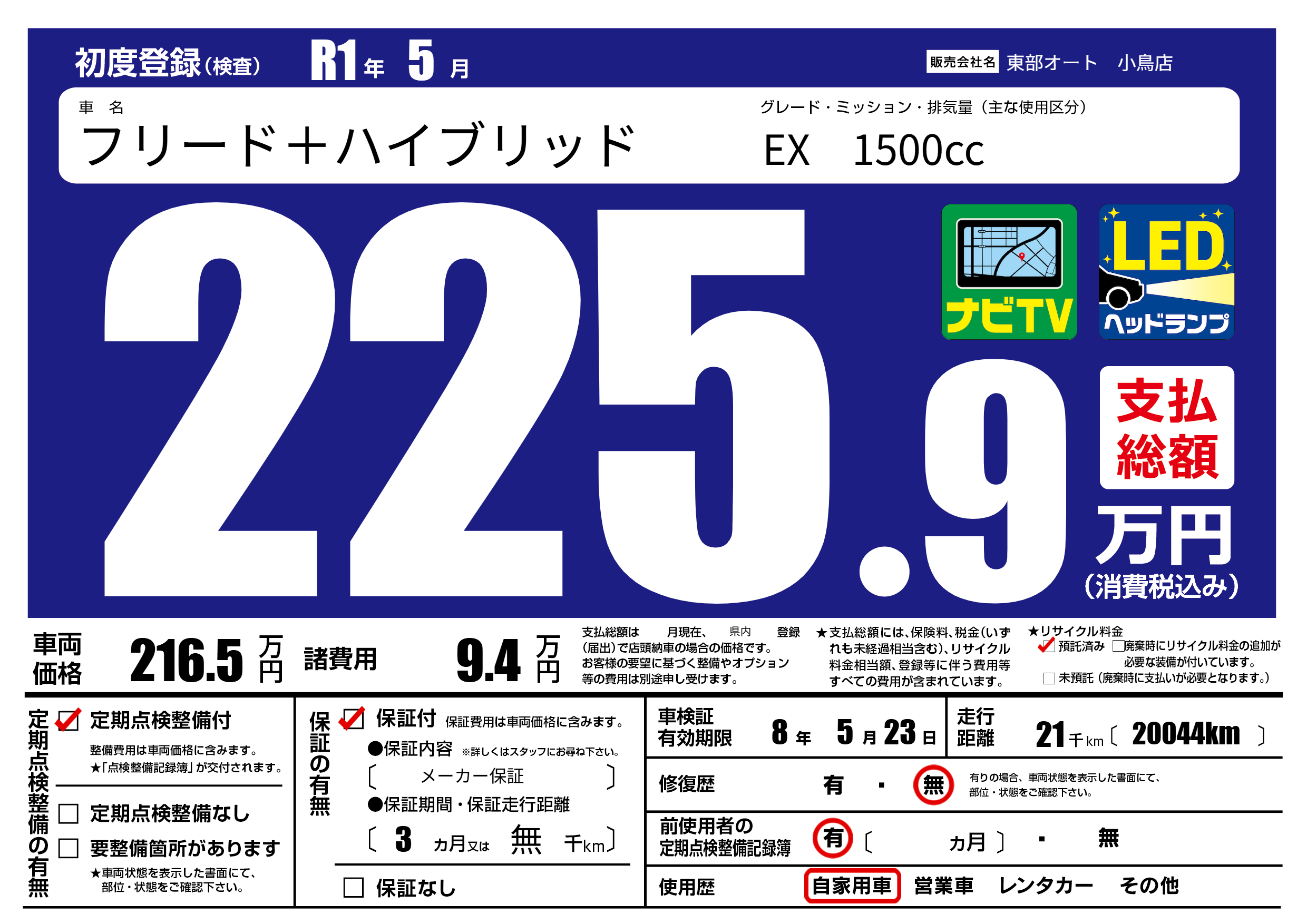 | 車名 | フリード+ハイブリッド | グレード ミッション 排気量 |