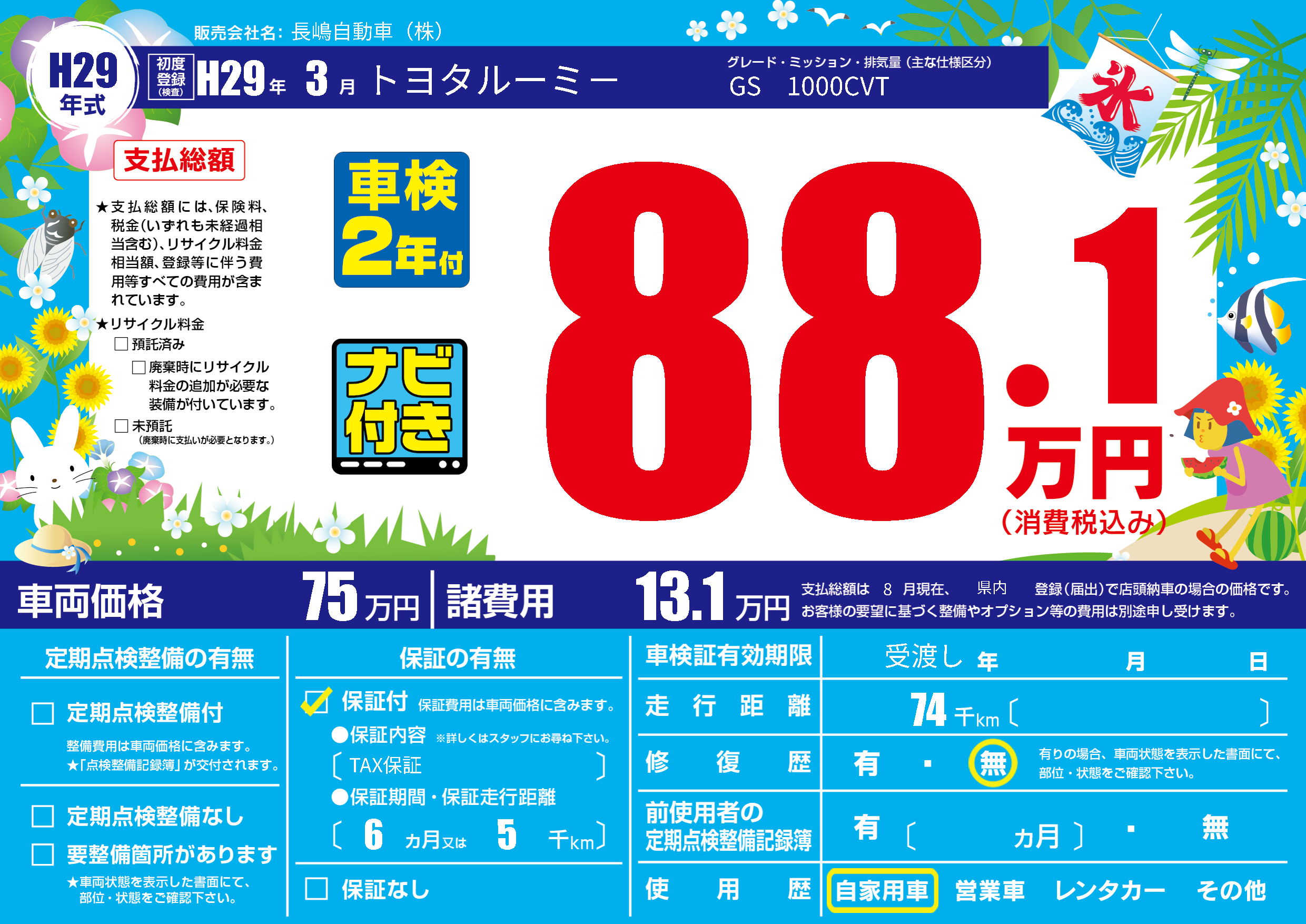 | 車名 | トヨタルーミ- | グレード ミッション 排気量 |