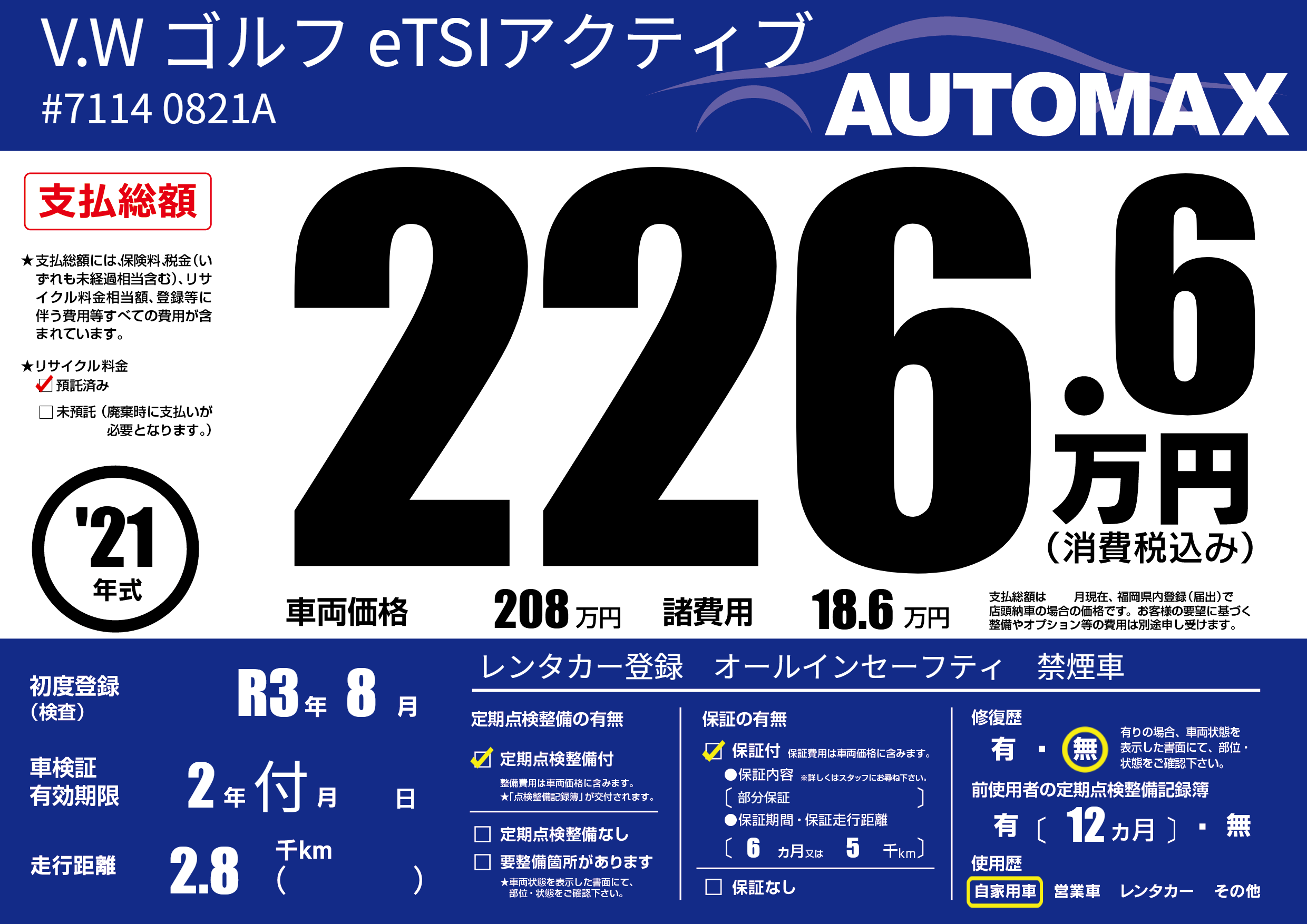 | 車名 | V.W ゴルフ eTSIアクティブ | グレード ミッション 排気量 |