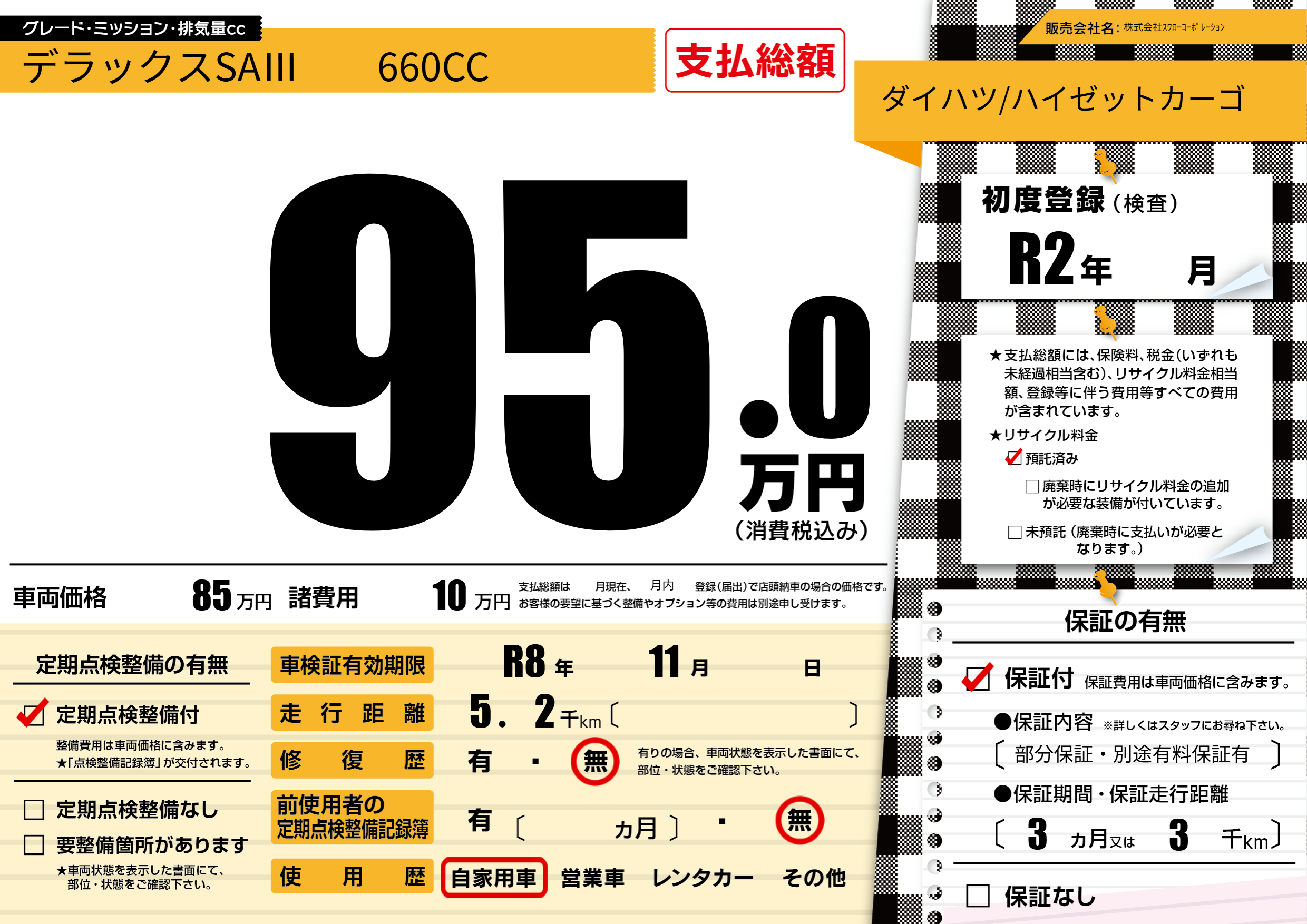 保証付き 保証内容(部分保証・別途有料保証有) 3ヶ月または(3)千kmまで |