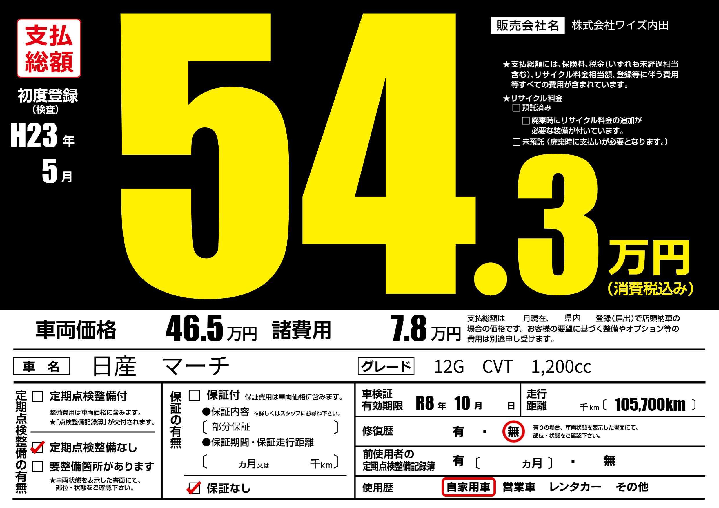 | 車検制限 | R8年 10月 - 日 | ||