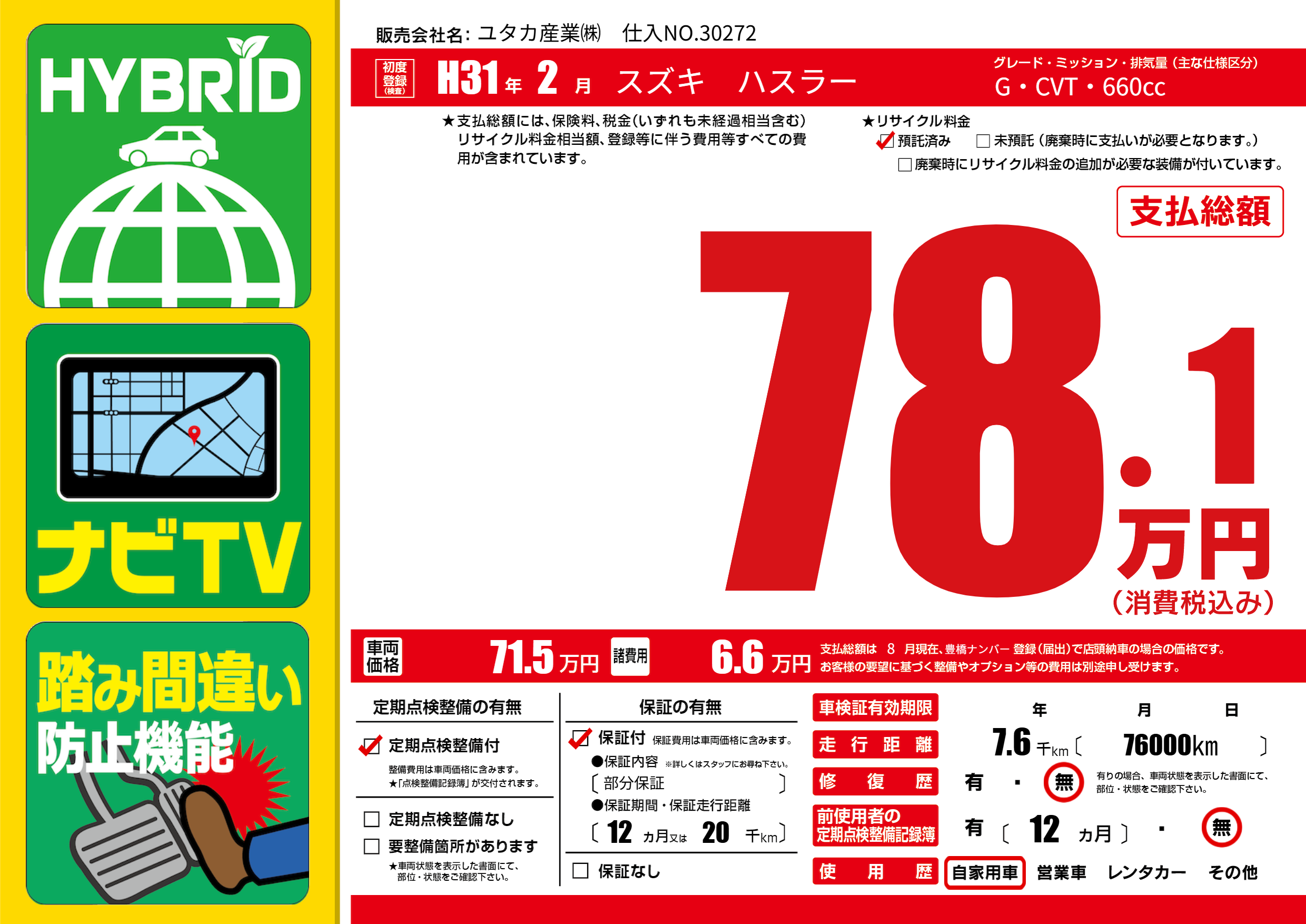 | 車名 | スズキ ハスラー | グレード ミッション 排気量 |