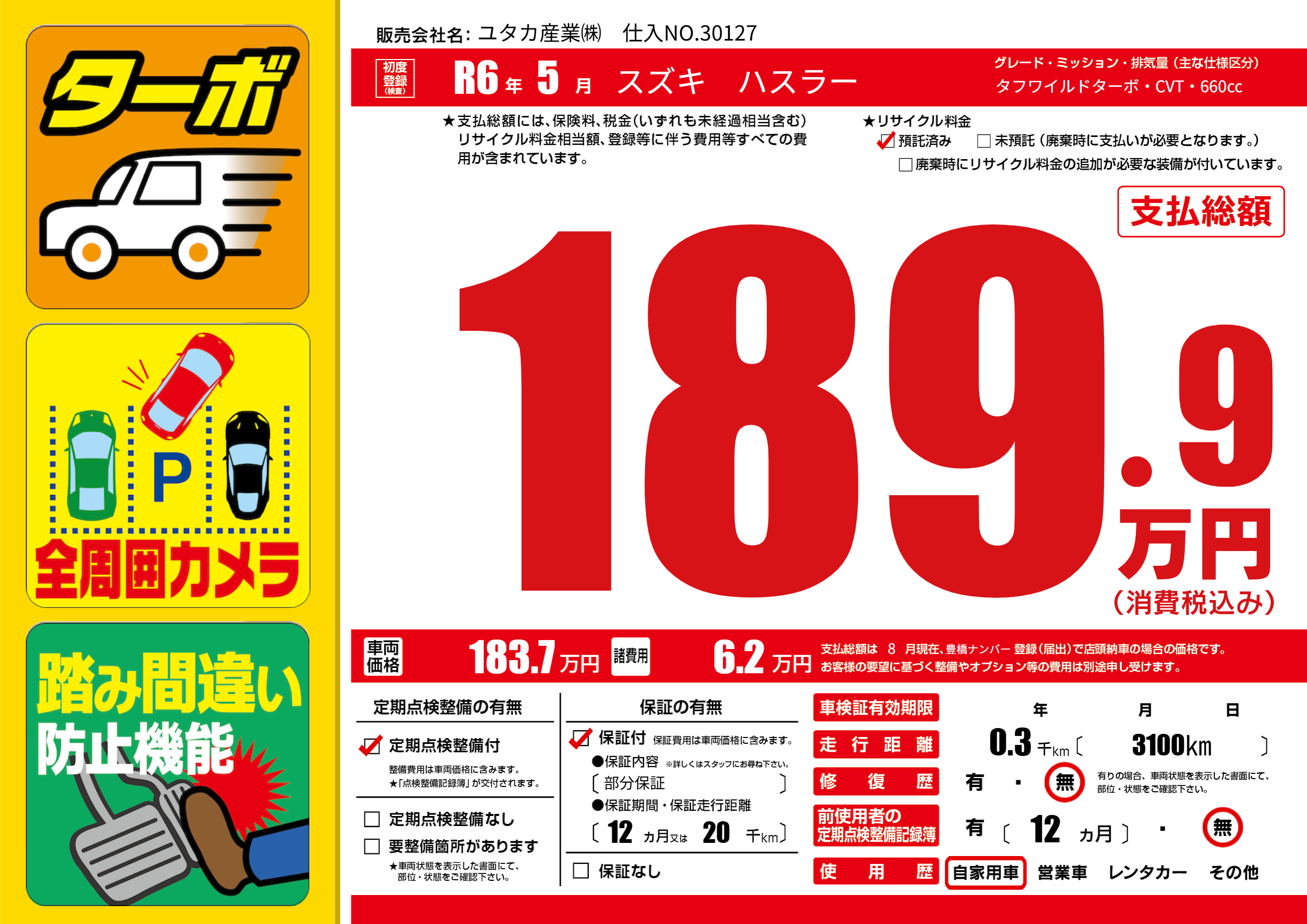 | 車名 | スズキ ハスラー | グレード ミッション 排気量 |