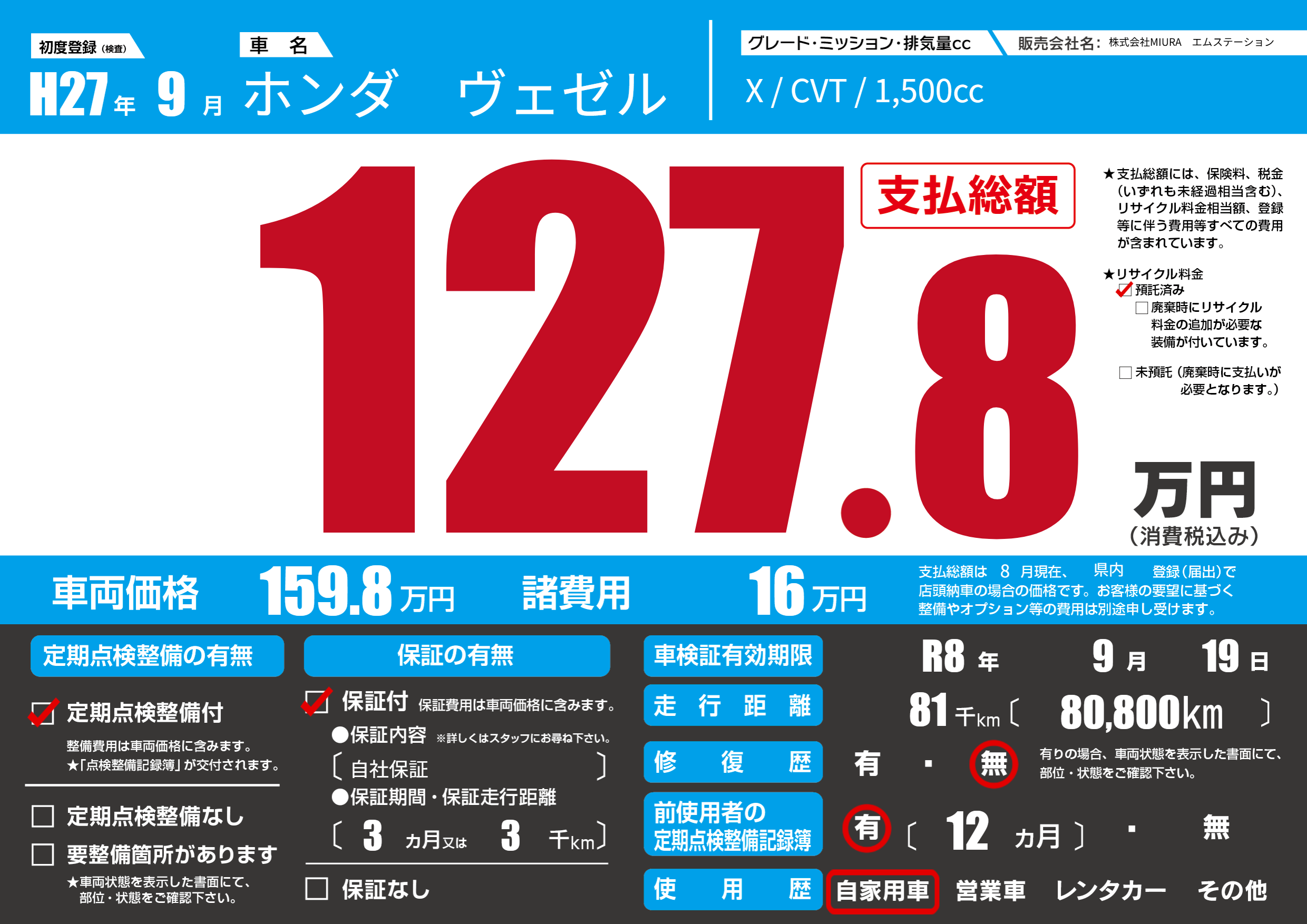 | 走行キロ | 8.1万km | 初年度登録 | H27年9月 |