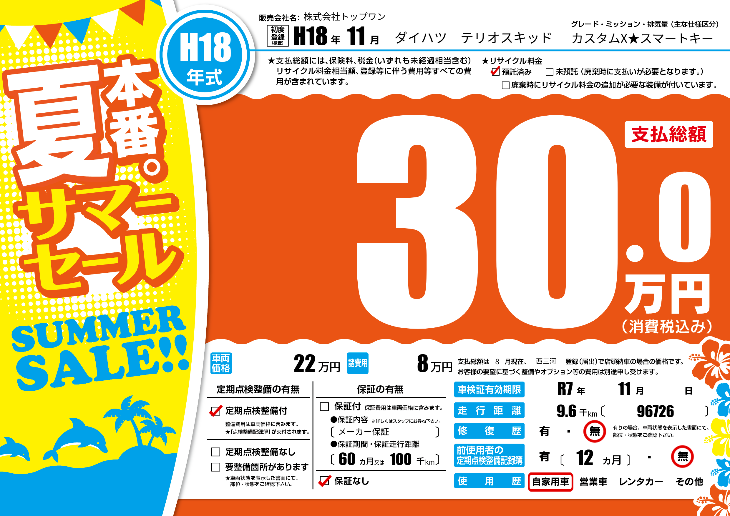 | 走行キロ | 0.9万km | 初年度登録 | H18年11月 |