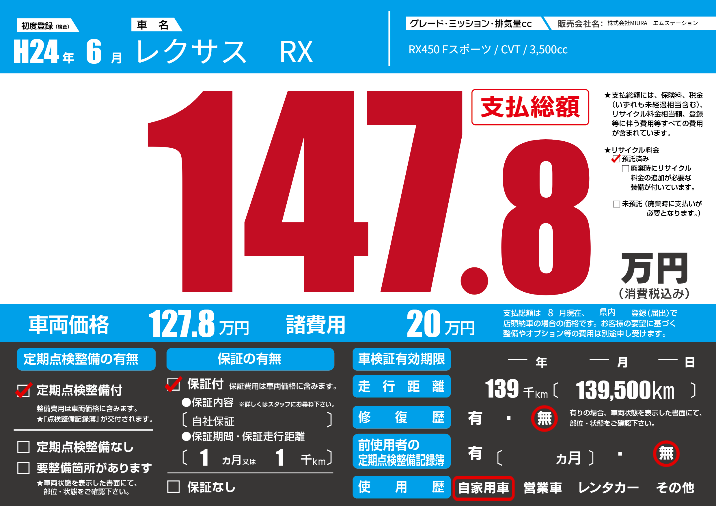 | 車名 | レクサス RX | グレード ミッション 排気量 |