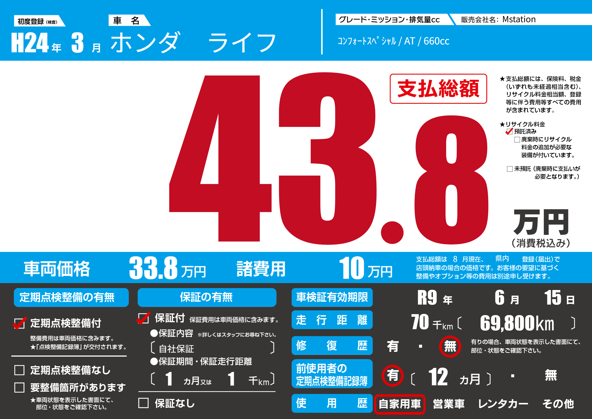 | 車名 | ホンダ ライフ | グレード ミッション 排気量 |