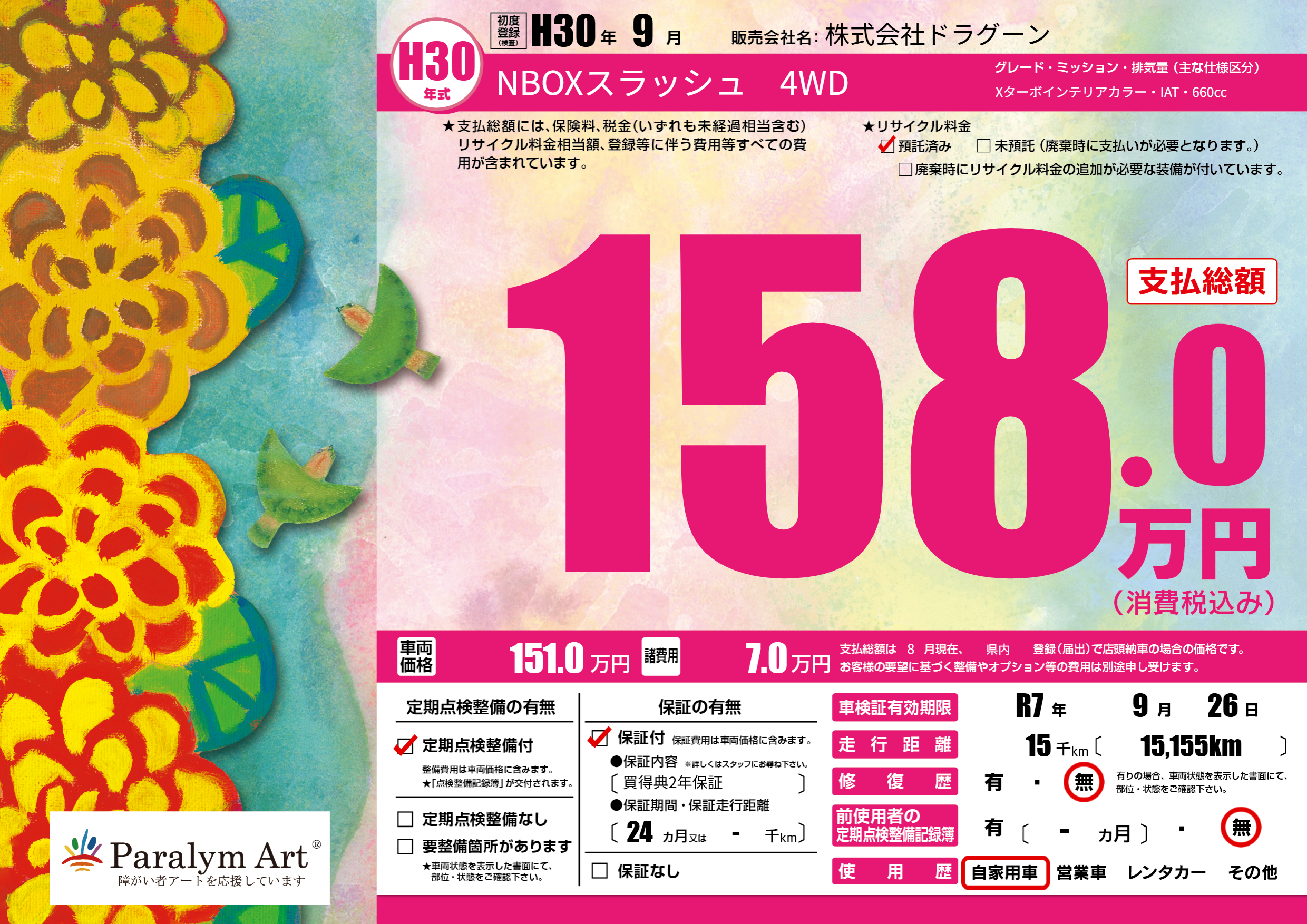 | 車名 | NBOXスラッシュ 4WD | グレード ミッション 排気量 |