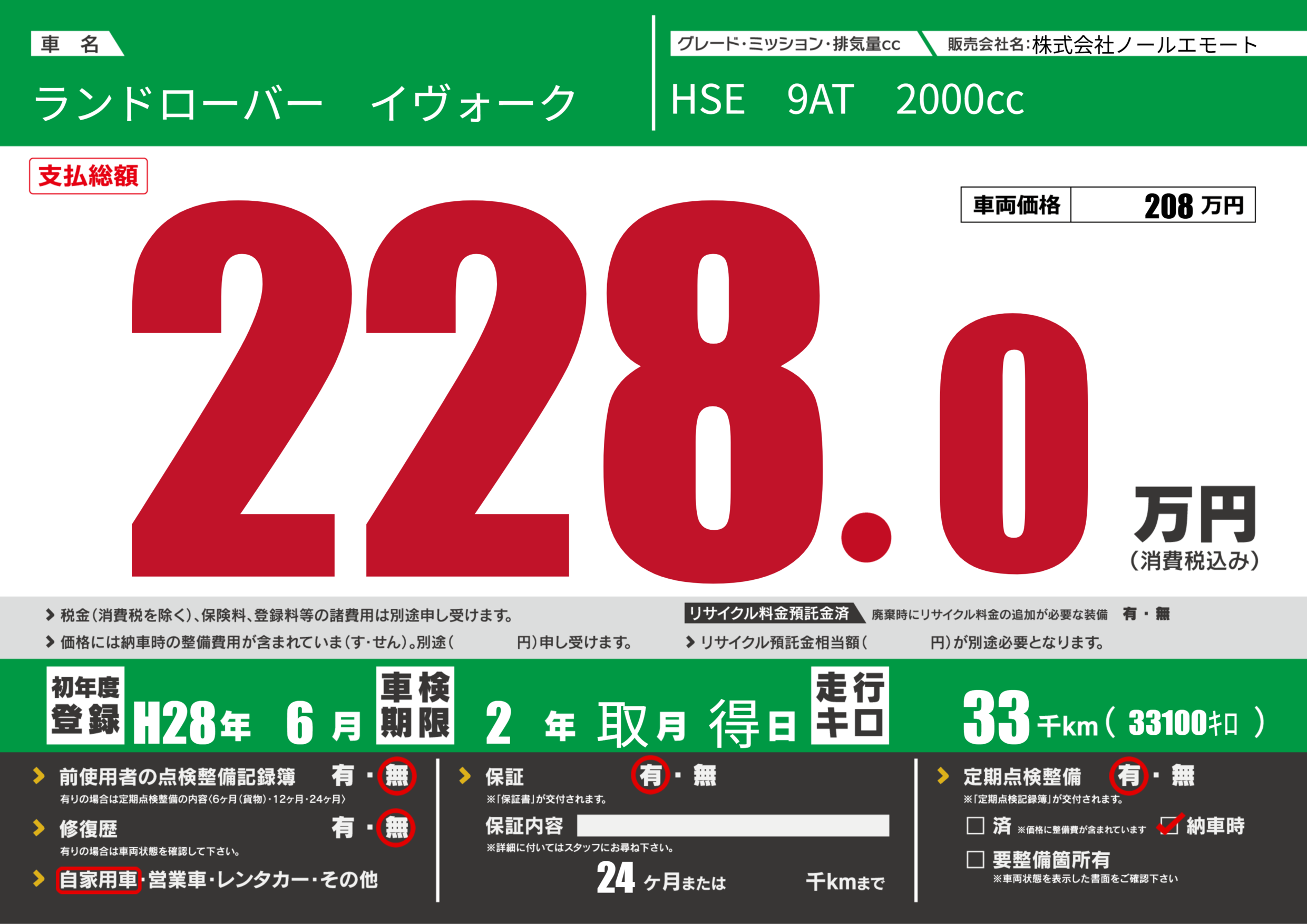 | 車名 | ランドローバー イヴォーク | グレード ミッション 排気量 |