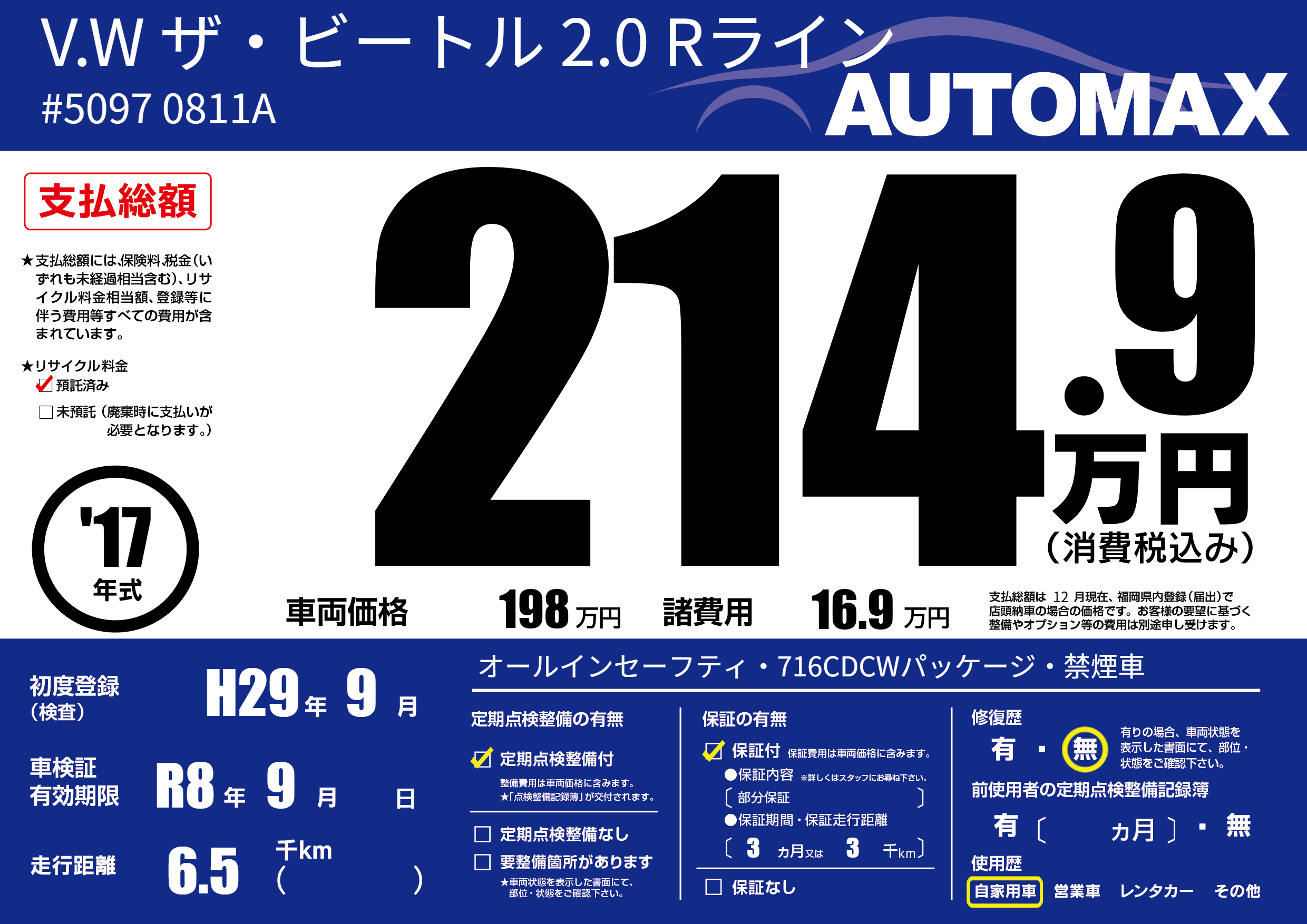 | 車名 | V.W ザ・ビートル 2.0 Rライン | グレード ミッション 排気量 |