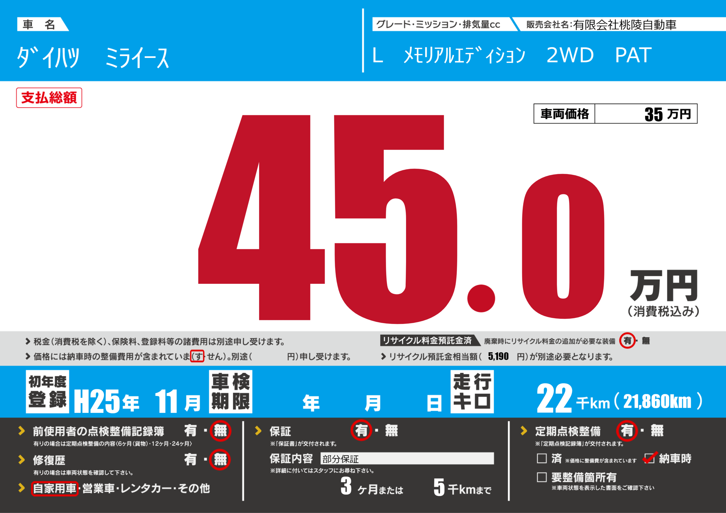 保証付き 保証内容(部分保証) 3ヶ月または(5)千kmまで |