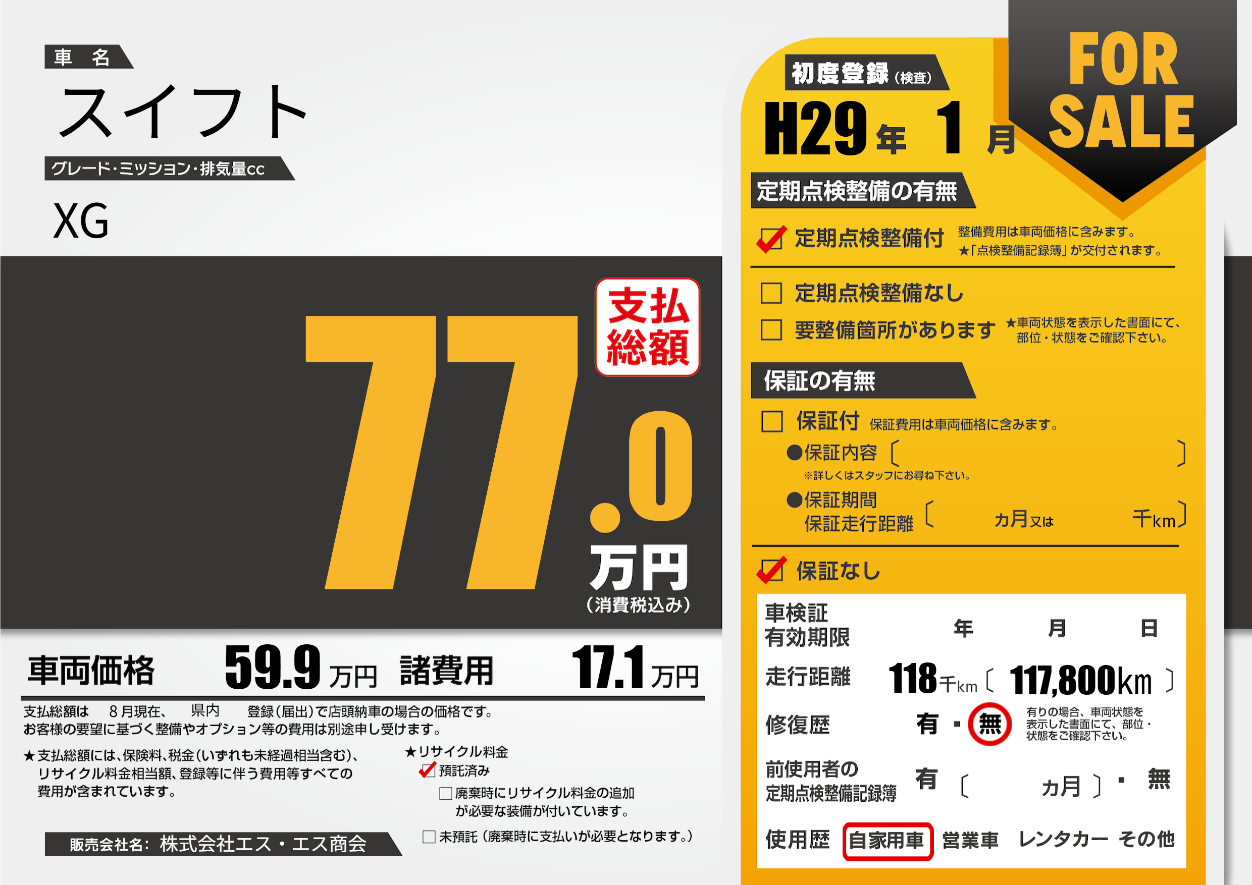 | 車名 | スイフト | グレード ミッション 排気量 |