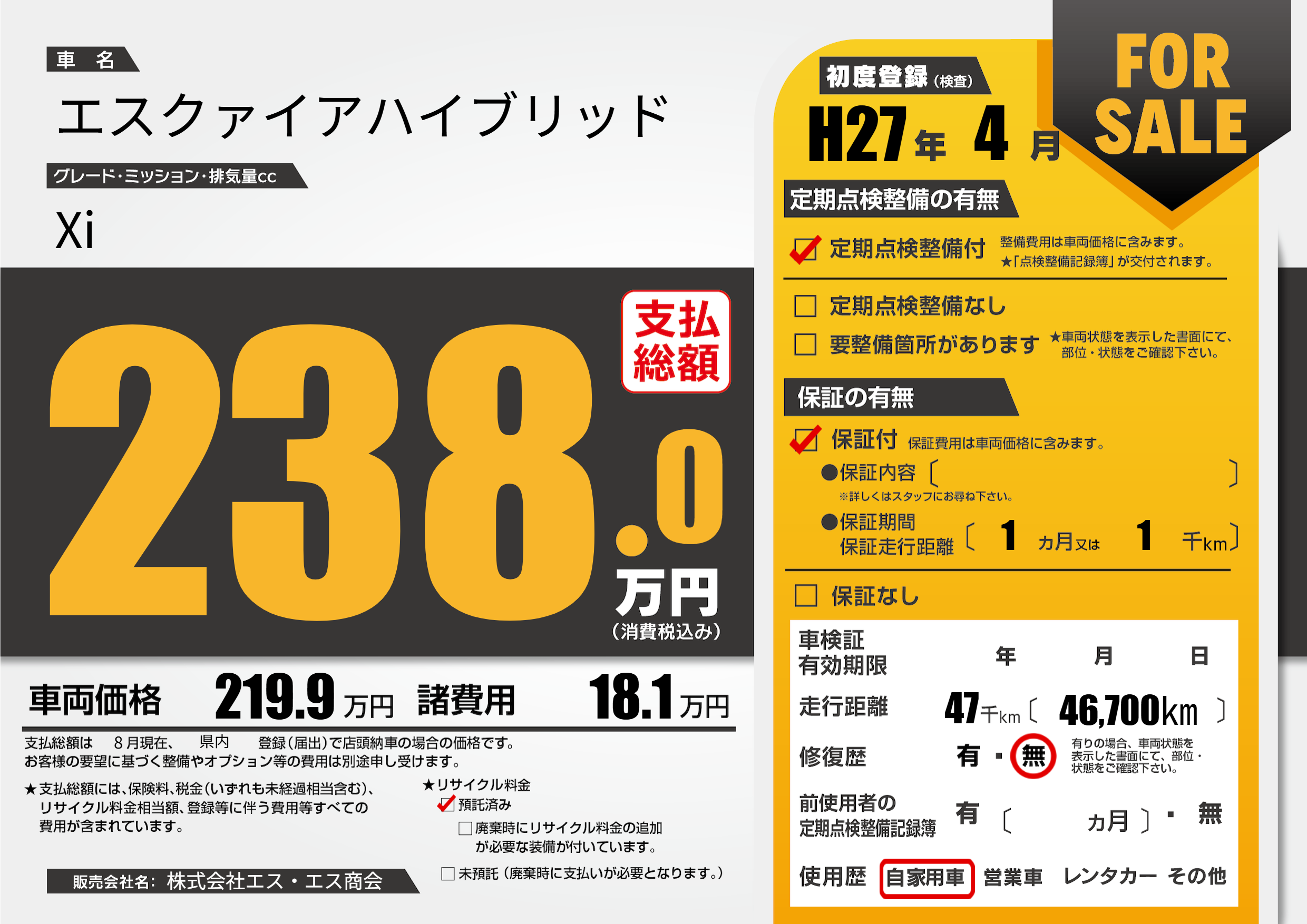 | 走行キロ | 4.7万km | 初年度登録 | H27年4月 |