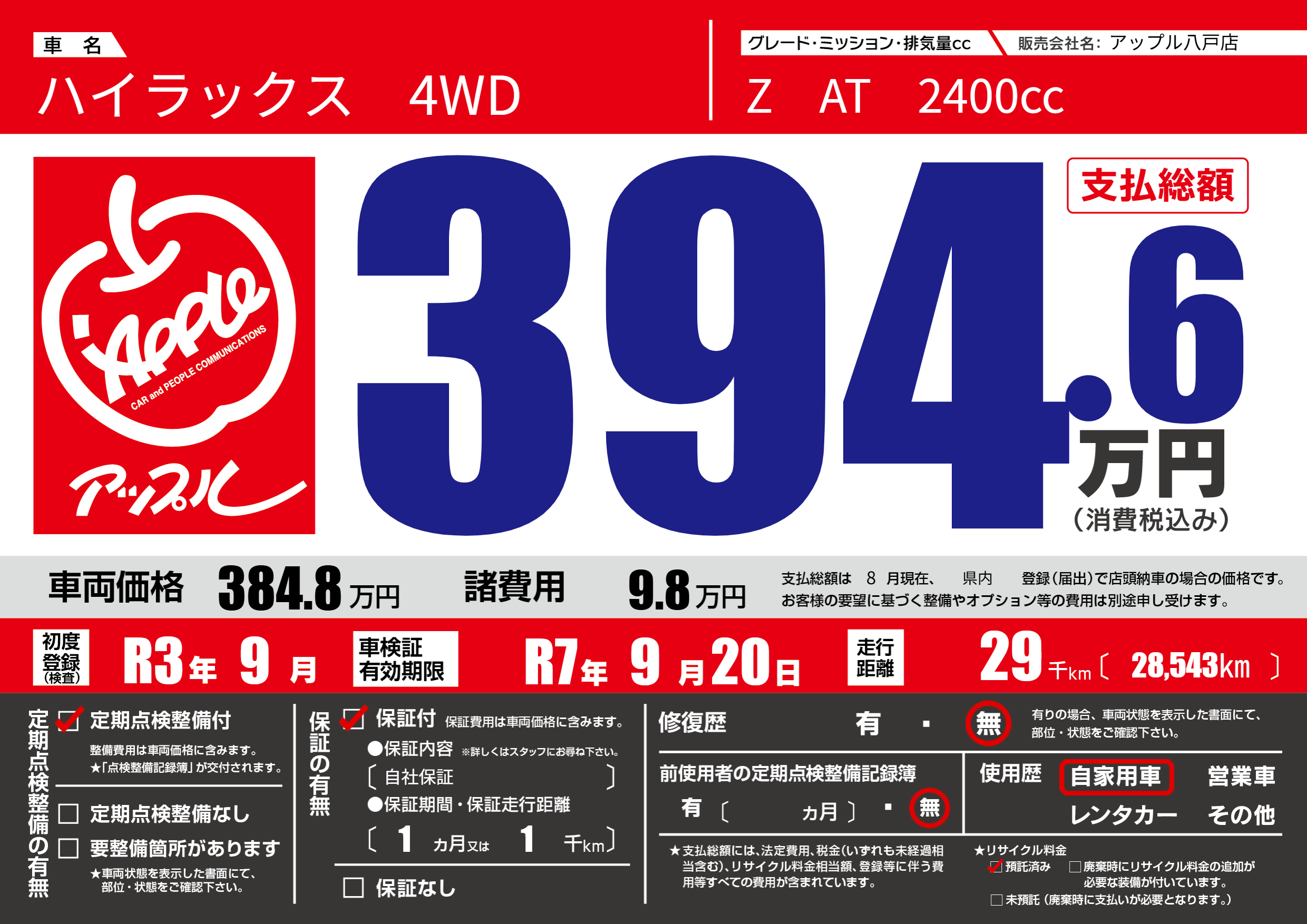 | 走行キロ | 2.9万km | 初年度登録 | R3年9月 |